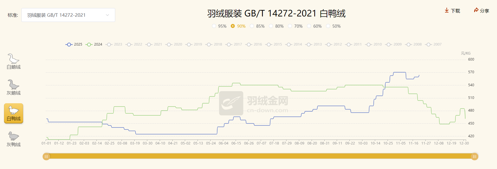 羽绒金网数据显示,自2024年初以来,羽绒的价格一直走高,并于当年夏天到达了最高点。按新国标羽绒服装90%绒子含量标准,自2023年1月初至2024年11月底,白鸭绒与白鹅绒的价格已分别从约350元/公斤和700元/公斤,涨至约500元/公斤和约1100元/公斤。