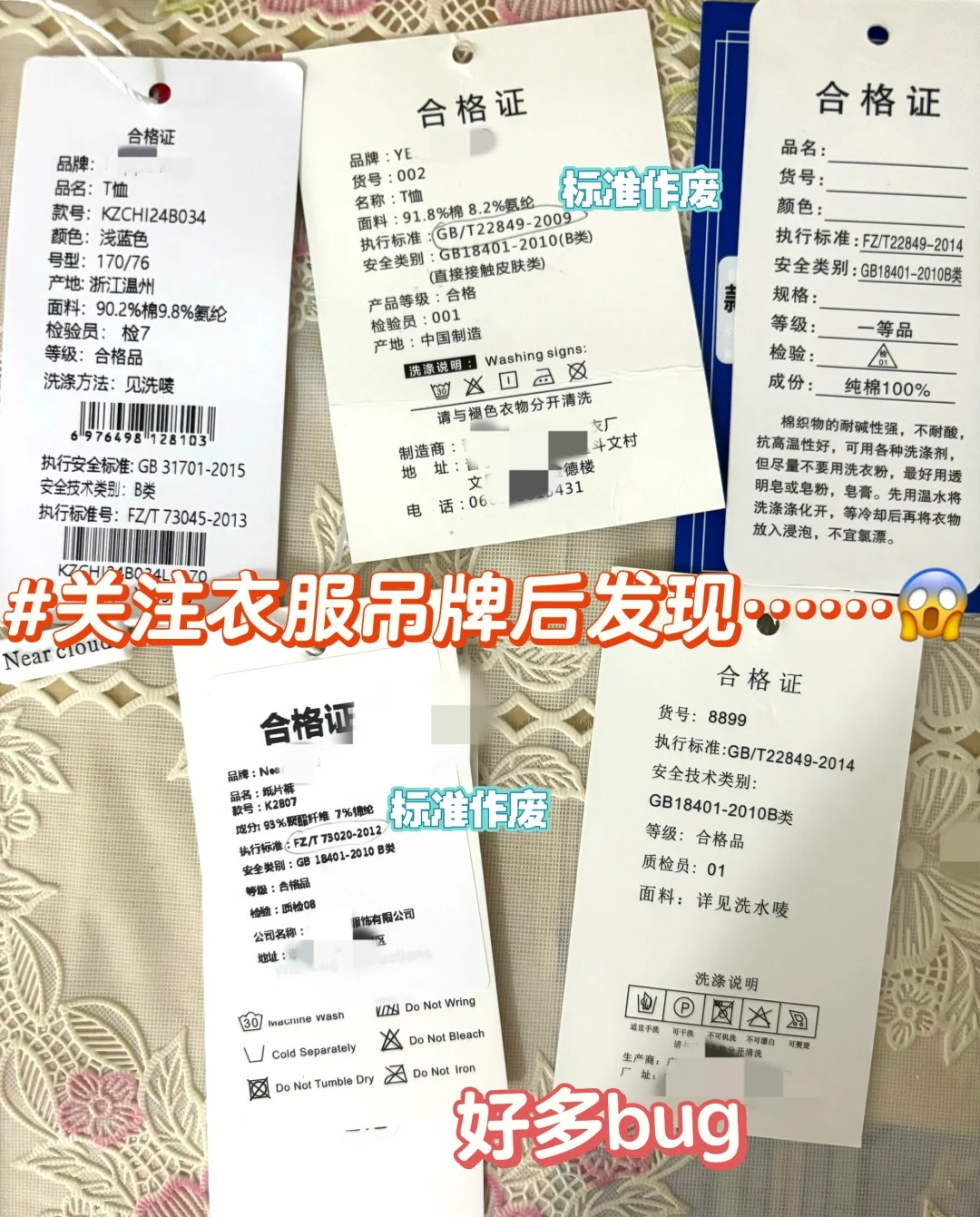 如果这些东西都没有,我们就无法得知衣服的面料和成分安全类别等等,如果是回收的旧衣服或者是使用了劣质的布料制作的衣服,就不值得我们买了!