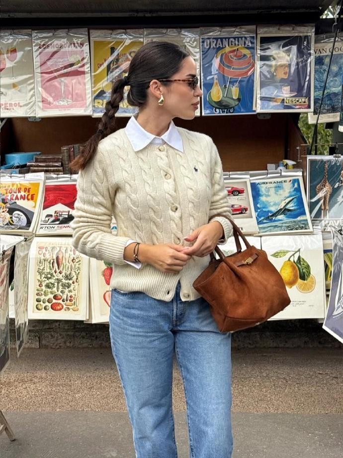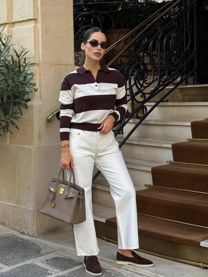 Jelena的穿搭字典里,“基础款是骨架,小设计是血肉”是不变的法则。她的衣柜里永远少不了白T恤、牛仔裤、针织衫这类百搭单品,但她总能通过细节选款让基础款焕发光彩。比如一件简单的白色T恤,她会pick领口带有小刺绣或袖口做了卷边处理的款式,搭配一条高腰破洞牛仔裤时,会把T恤下摆轻轻打个结,露出一点点腰线,再踩一双白色帆布鞋,手里拎一个帆布托特包,瞬间就有了青春活力的感觉。而对于针织衫,她偏爱软糯的马海毛或羊绒材质,颜色多选莫兰迪色系,搭配一条同色系的缎面半身裙,温柔中带着一丝精致;如果想走休闲路线,就换一条工装裤,脚上搭一双马丁靴,甜酷之间的切换自然又流畅,完全没有违和感。