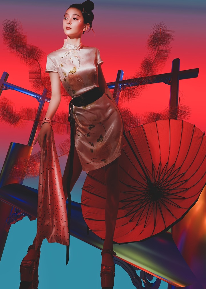 1. 画面分析,可以看到上面这张图片,图中的人物身着具有中国味道的旗袍,但却以时尚感妆容和鞋子来形成对比,显得特别又吸睛;而背景中的色彩大胆夸张,充满未来感,并且融入中国风元素同样形成碰撞,看似大胆的元素搭配背后,实则细节感满满。