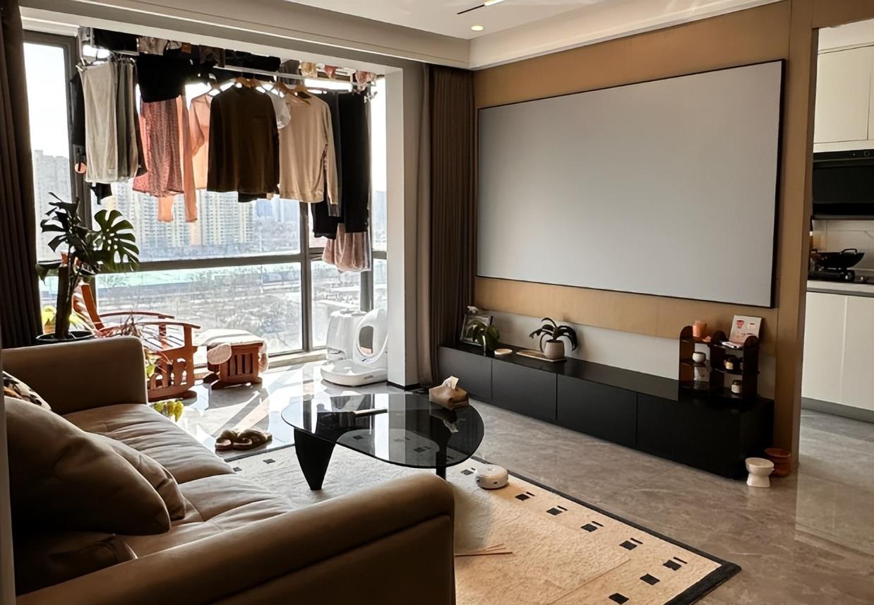 阳台都有两个垛子,大家可以将晾衣架隐藏在侧面,从客厅来看,你根本看不到晾衣架,保证美观效果。