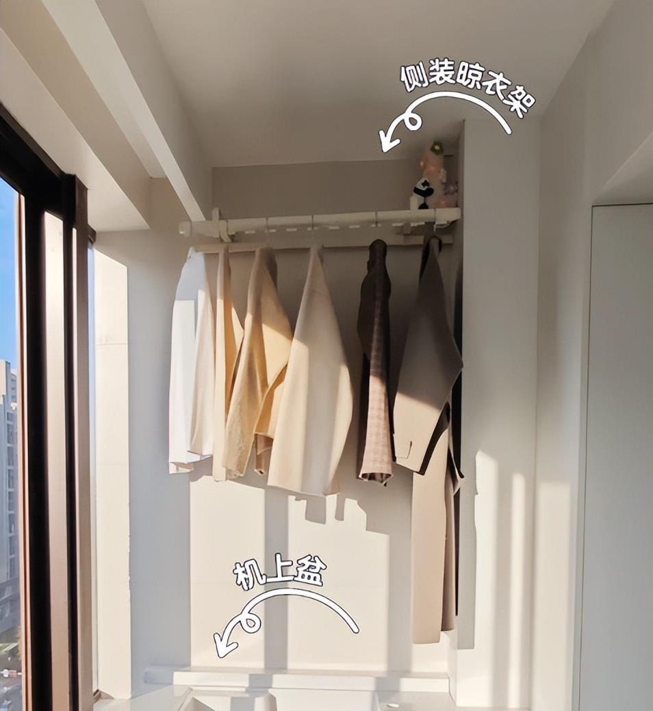 做法很简单,在装修前跟师傅说在在侧面去装晾衣架,直接定制组装上去就行。晾衣杆可以做两层的设计,这样能晾晒更多的衣服,跟在明面上晒衣没有什么区别。