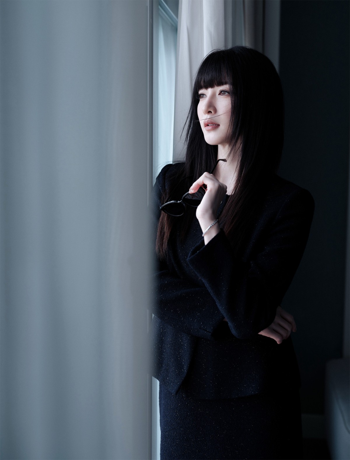 谁说御姐不能变身‘学霸女神’?最近江疏影在一场品牌活动上直接来了个风格大跳水——卷发没了,露额头不见了,取而代之的是厚重齐刘海+黑长直+圆框黑眼镜三件套,瞬间从红毯女王切换成图书馆常驻女主。配上一身剪裁利落的黑色西装和黑丝高跟鞋,冷感拉满,气场依旧在线,但这次不是‘姐就是女王’,而是‘同学,这题我讲过三遍了’。
