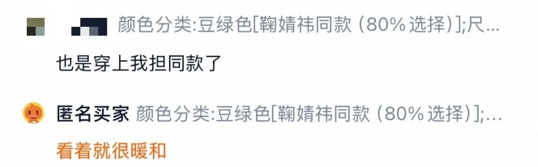 在鸭鸭的官方旗舰店某代言人同款产品评论区内,有消费者留言:也是穿上我担同款了