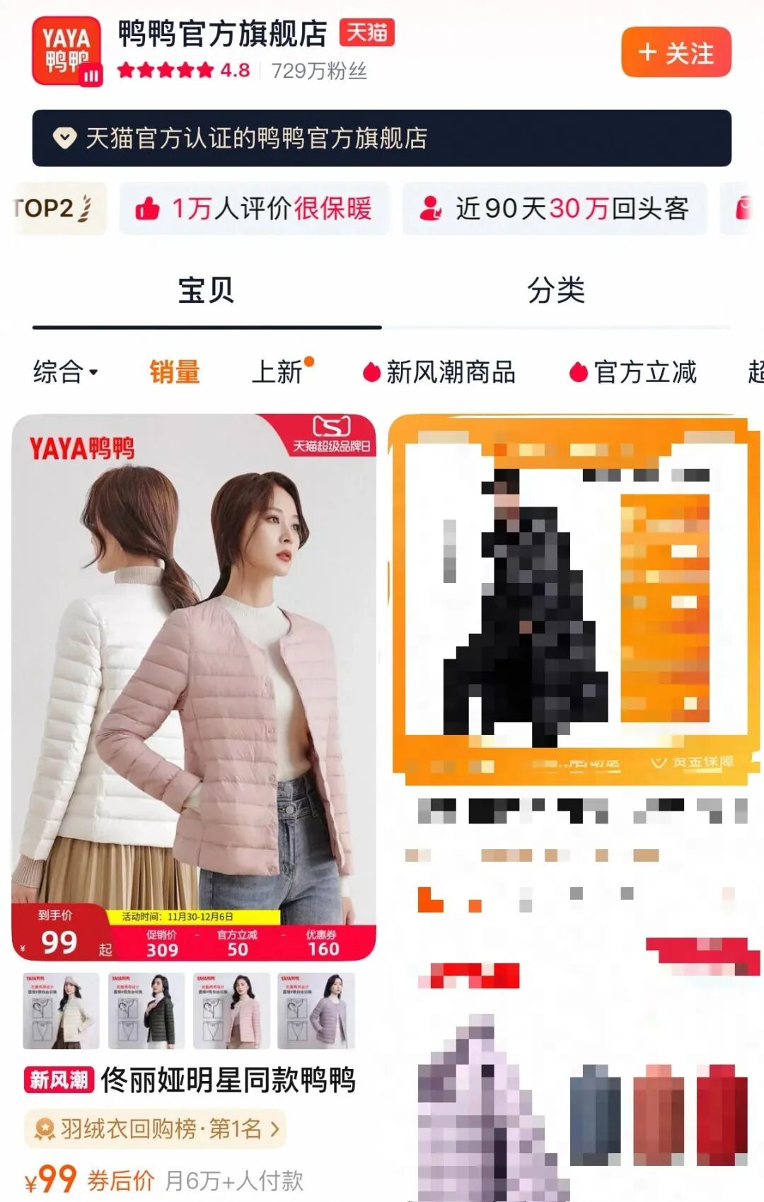在鸭鸭淘宝官方旗舰店里,销量最高的产品仍然是单价99元的薄款羽绒服