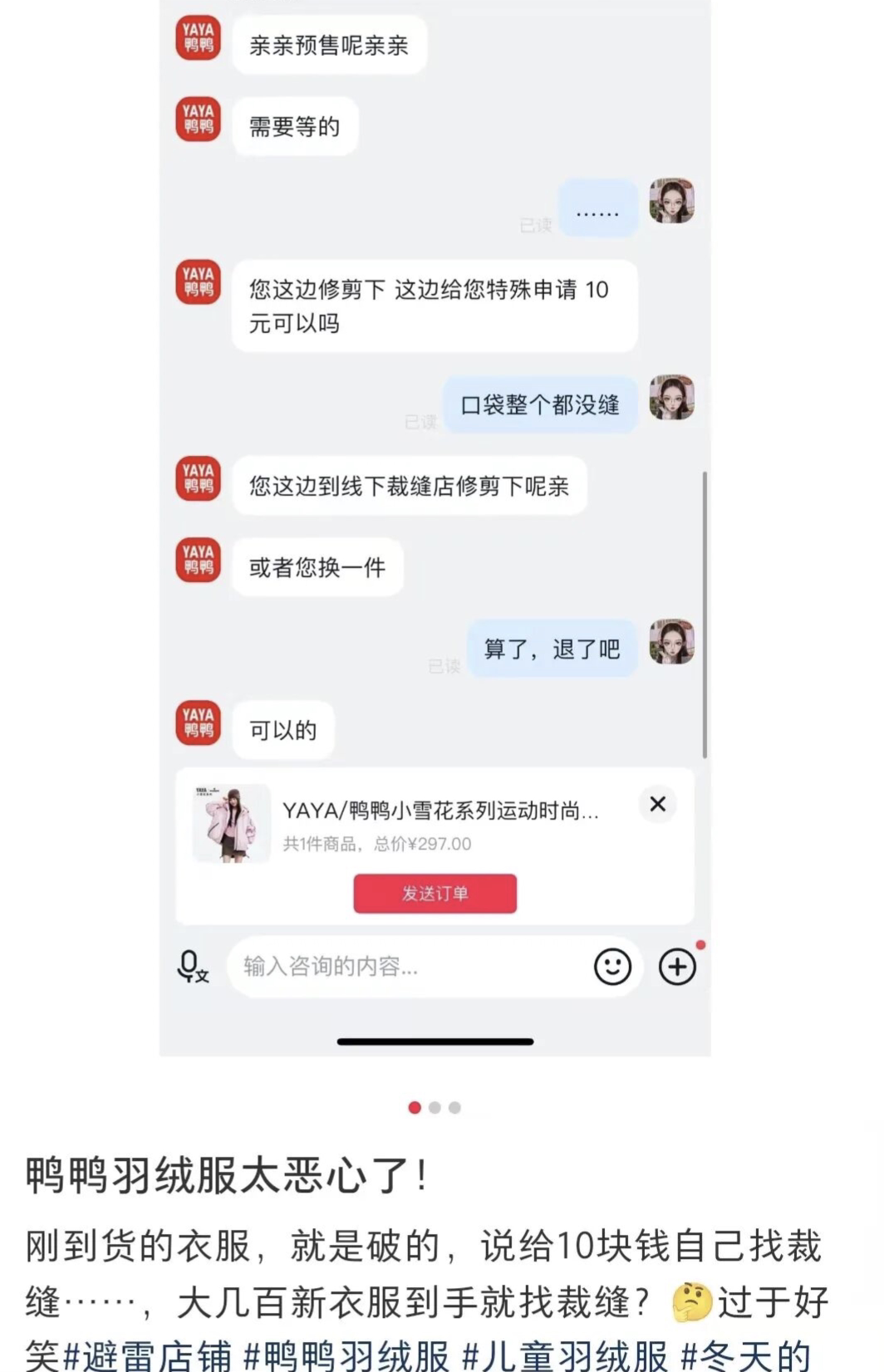 在喜人的业绩背后,社交媒体上仍有大量的吐槽存在,直指“异味明显”“充绒量不足”“做工不好”等质量问题,或者是“发错颜色、尺码”等操作问题。在浏览完这些讨论之后,本想尝试购买一件鸭鸭羽绒服的郭婷,还是决定放弃,“都在说鸭鸭不好,还是不买了”。