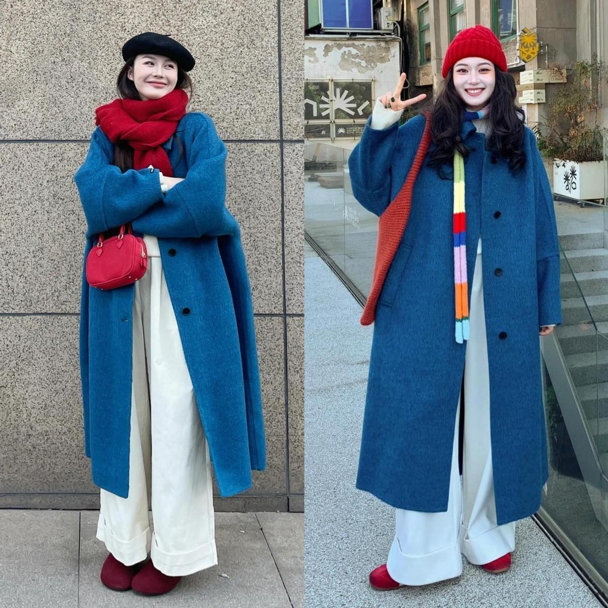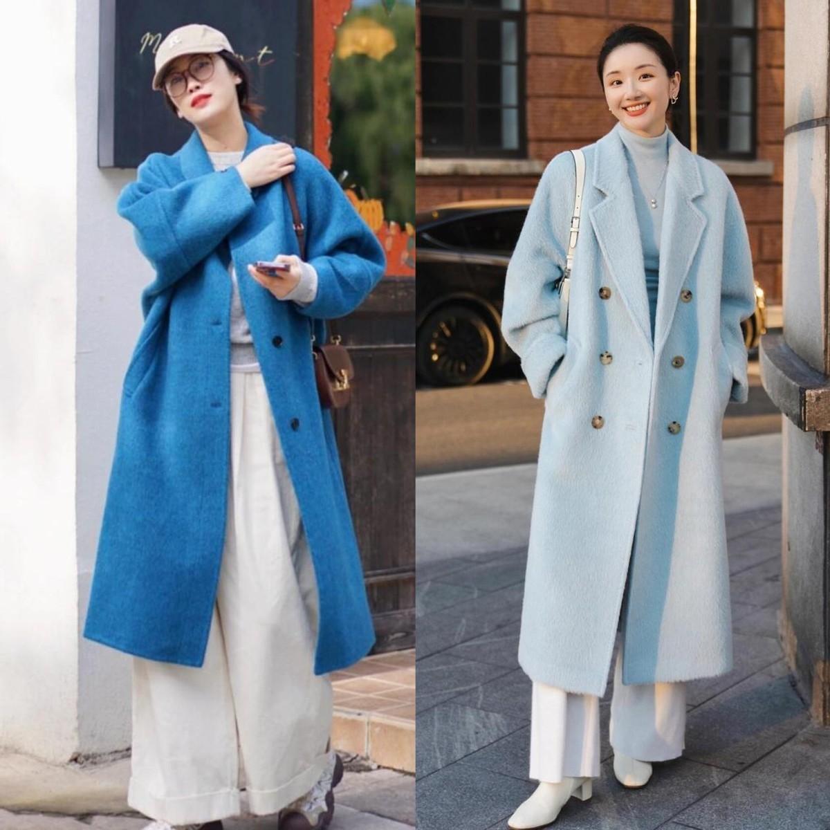雾霾蓝大衣+白色阔腿裤的组合很适合冬天,雾霾蓝作为低饱和度的流行色,自带清冷高级感,对黄皮也十分友好,搭配白色阔腿裤,清新又显白。大衣选择中长款茧型版型,可以包容各种身材缺陷,再搭配围巾和帽子,轻轻松松增加搭配的氛围感,这套搭配无论是上班通勤还是周末出游,都能让你显得气质出众。