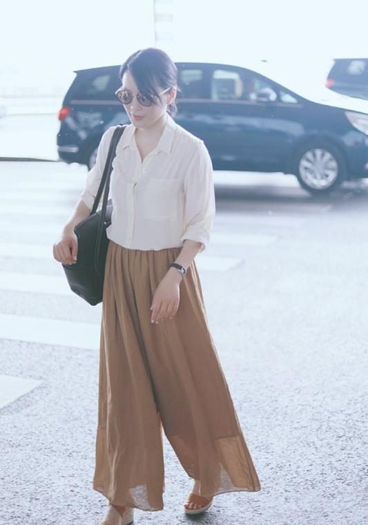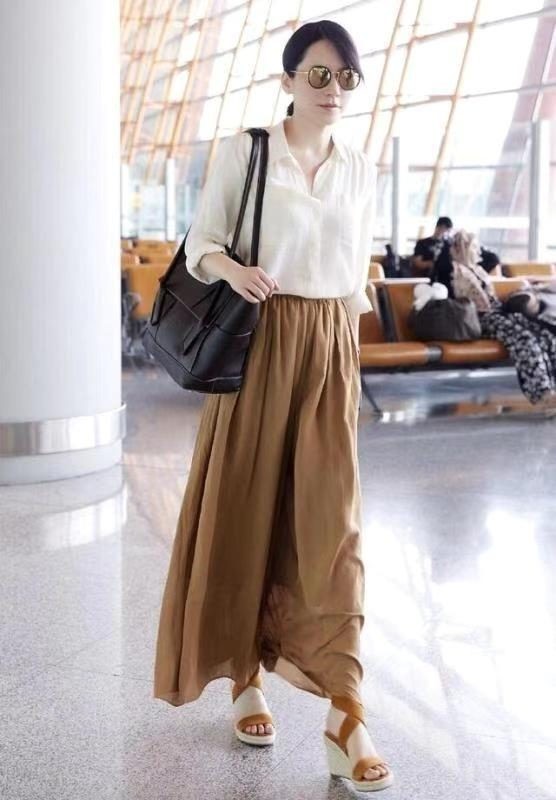 下身的阔腿裤松量不是一般的多,如果不多观察一会,容易让人误以为是条半身裙。裙子面料轻盈,适合在闷热天穿。不同的裤长会带给人不一样的视觉效果,如果裤长拖地,需要身高来支棱起来;如果裤长在脚踝处,显得人更干练有气场。七分裤、八分裤流行度也很高,怎么搭就要看季节了。
