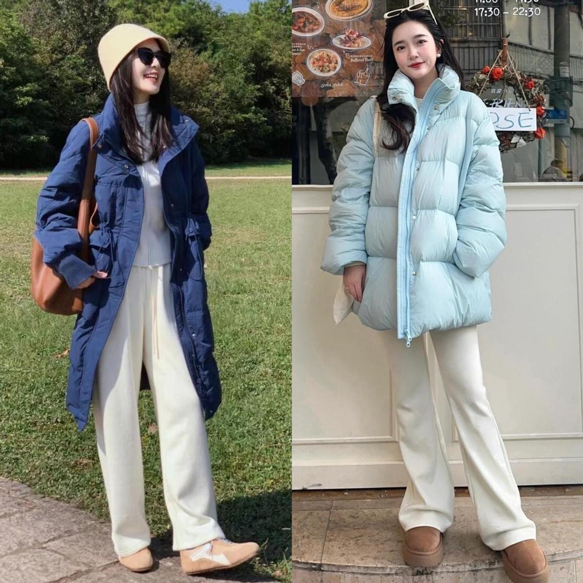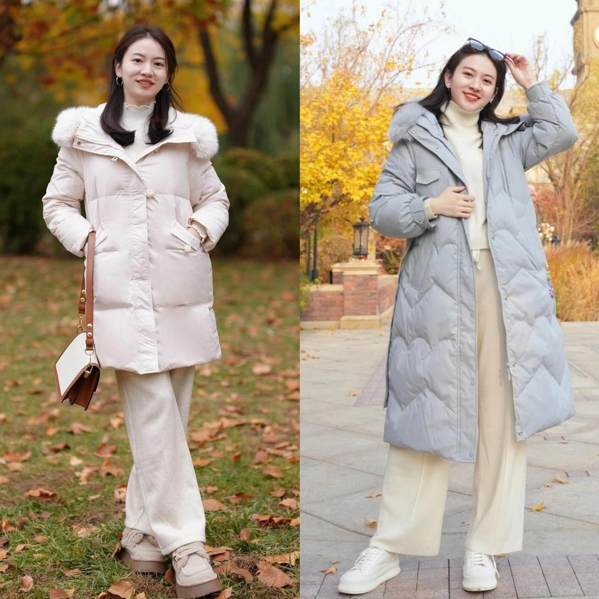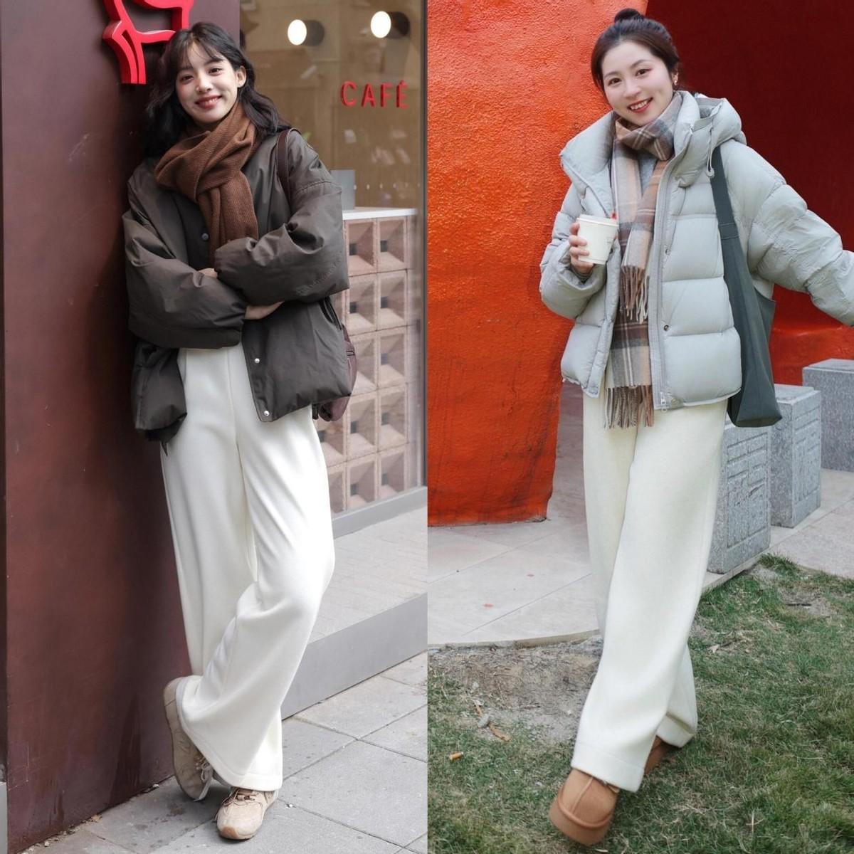 长款羽绒服搭配白色阔腿裤,简单大方还保暖,而这些小姐姐还搭配了白色的平底鞋,进一步延伸了比例,显得身材高挑。