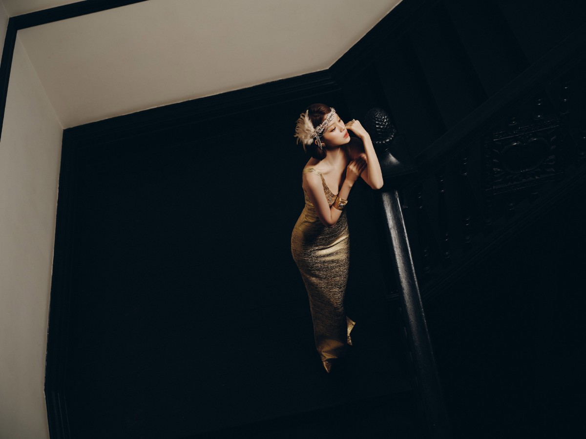 造型的成功离不开细节的精准把控。鱼骨束腰缎面礼服勾勒出流畅曲线,齐耳短发服帖地修饰面部轮廓,与电影中黛茜的标志性发型呼应。半遮面的面具下,深邃眼妆搭配红唇营造出“神秘千金”氛围,珠光眼影颗粒与面具铆钉形成巧妙呼应,香槟金提亮技法让面部立体感倍增。蜜桃色腮红与暖金礼服色调同频,裸色唇妆则刻意弱化存在感,避免抢夺头饰的视觉焦点,整套色彩搭配平衡又精致。