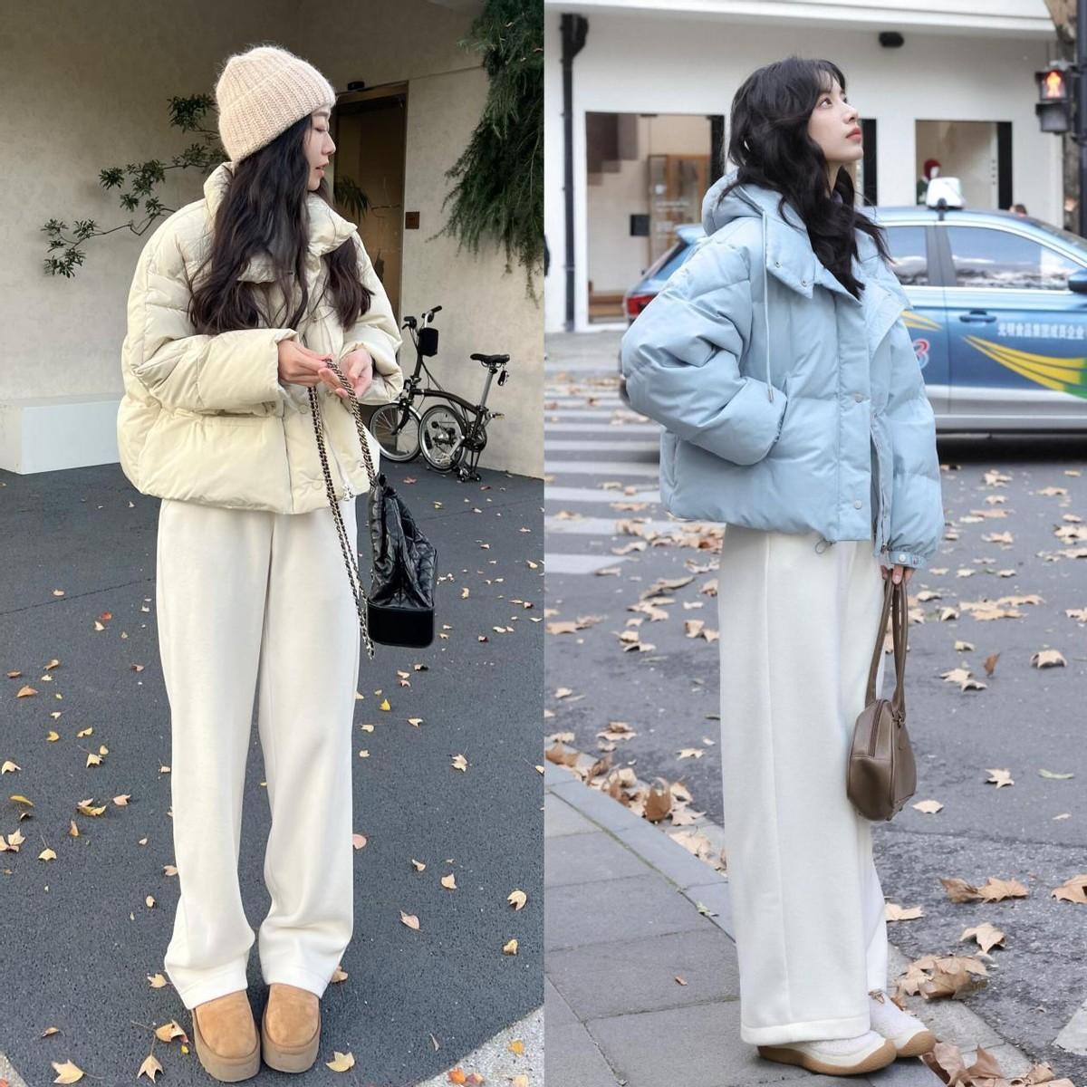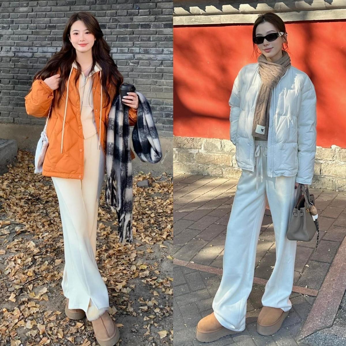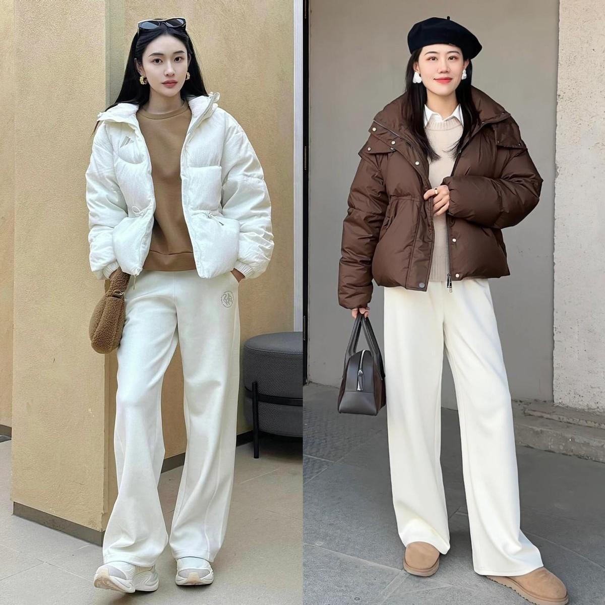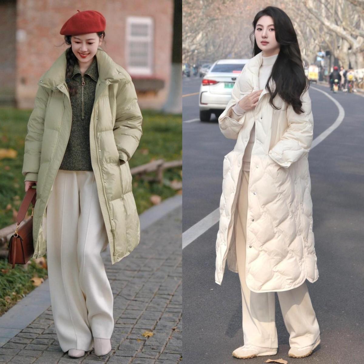 长款羽绒服搭配白色阔腿裤,简单大方还保暖,而这些小姐姐还搭配了白色的平底鞋,进一步延伸了比例,显得身材高挑。