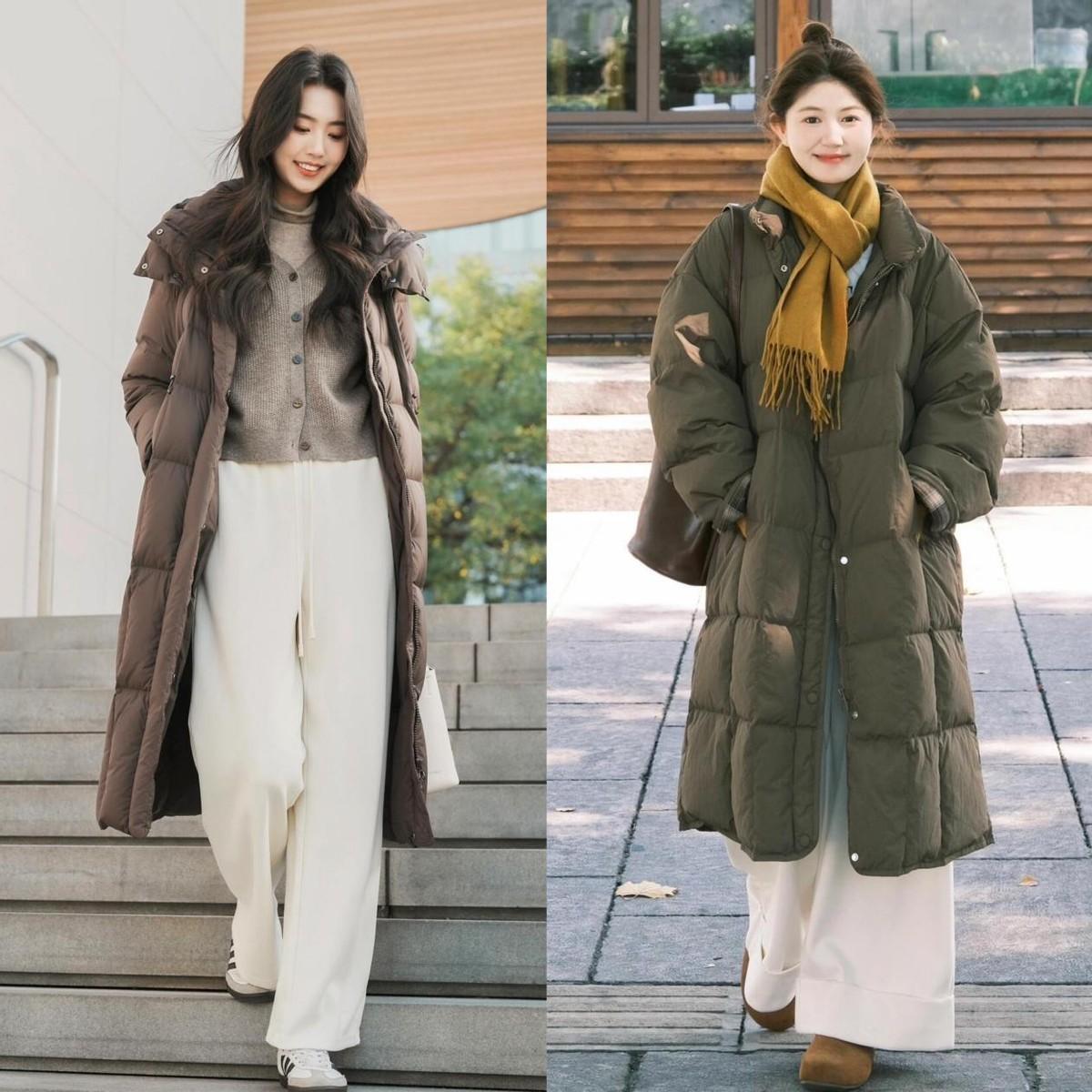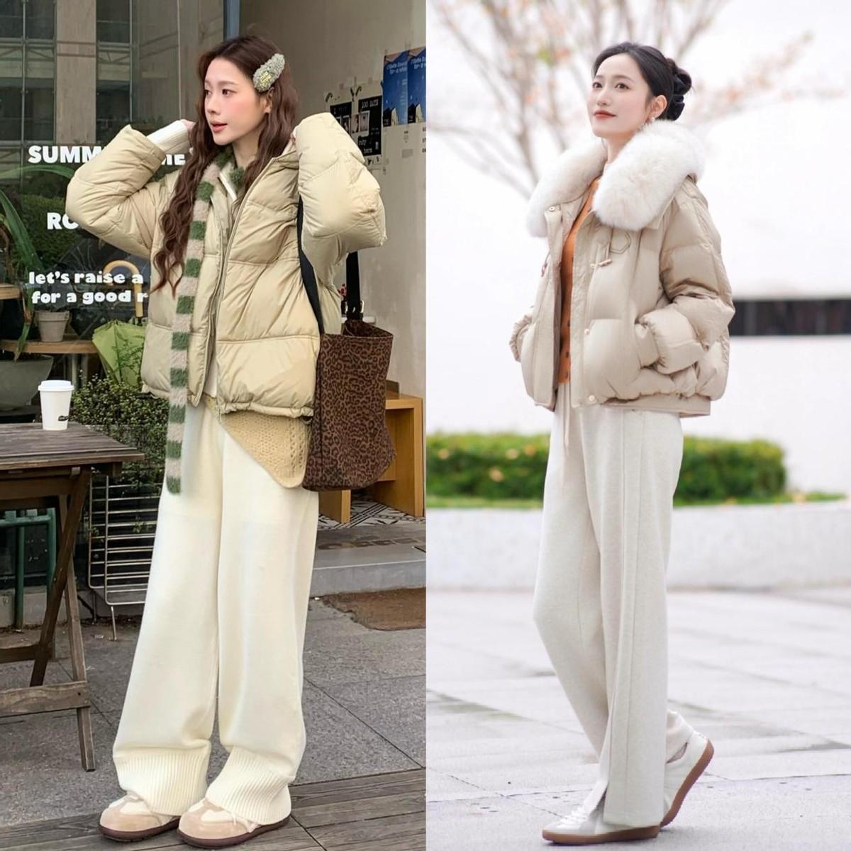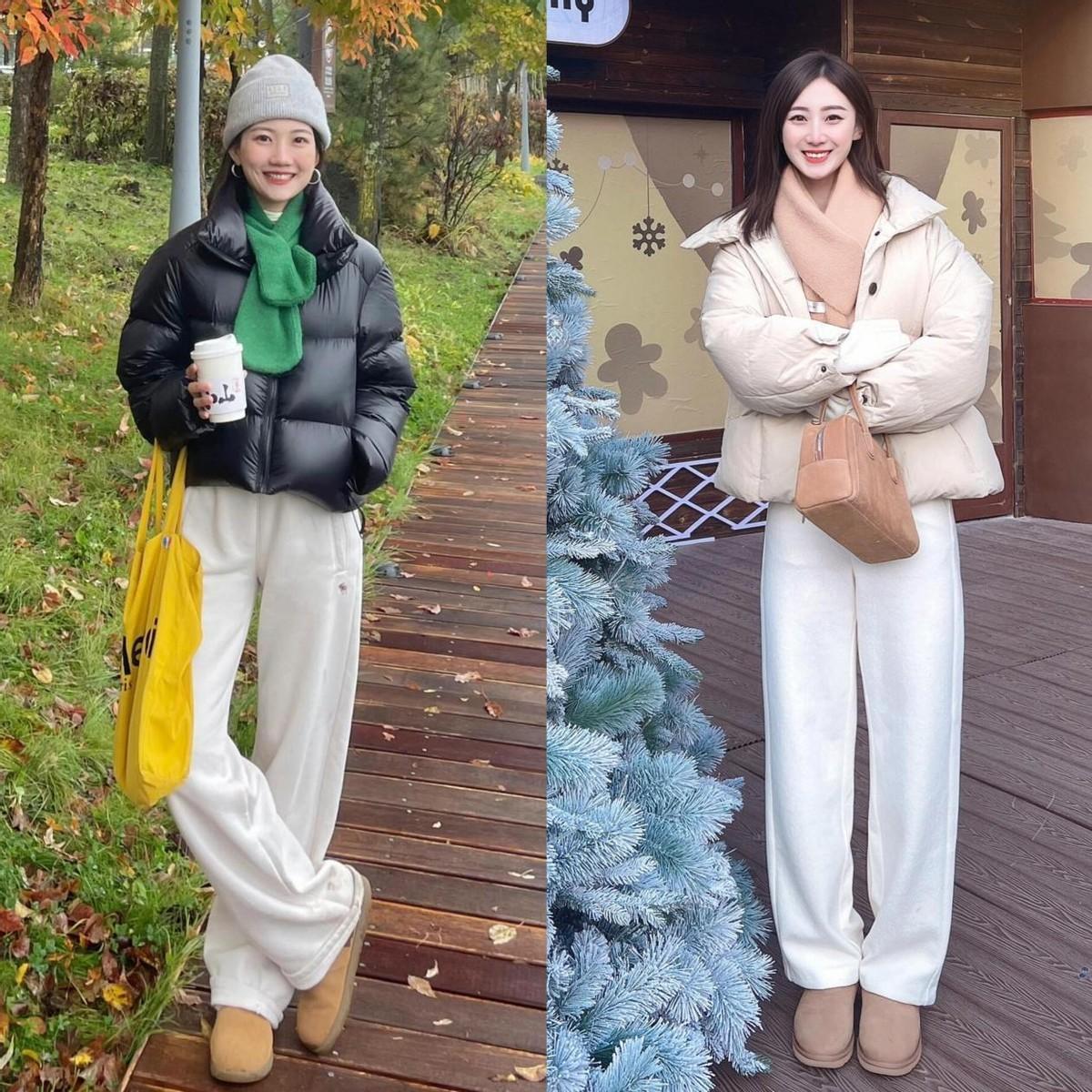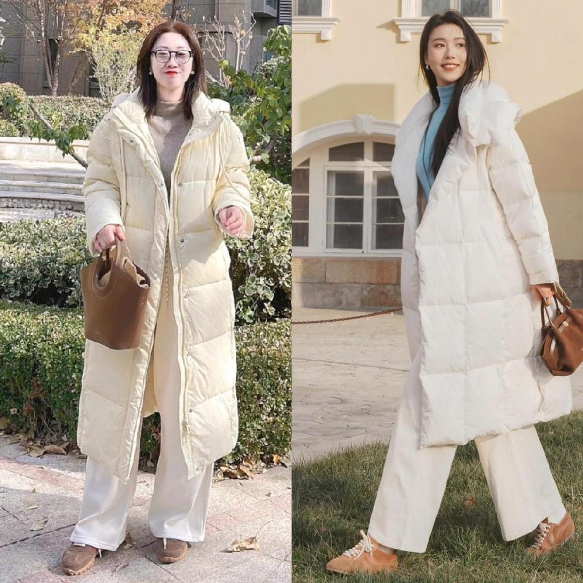 长款羽绒服搭配白色阔腿裤,简单大方还保暖,而这些小姐姐还搭配了白色的平底鞋,进一步延伸了比例,显得身材高挑。