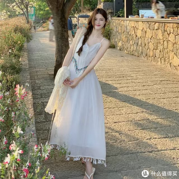 - 仙气飘逸:白色、浅薄荷色、淡卡其色吊带长裙