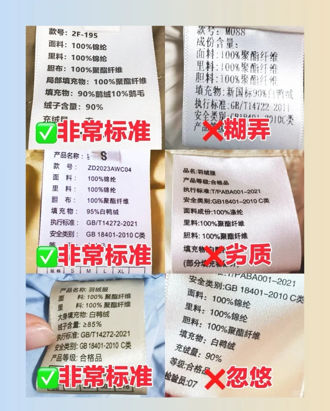 所以大家在买羽绒服的第1件事就是看标签,并不是所有的羽绒都叫真羽绒,新国标明确规定绒子含量必须≥50%才能叫做羽绒服。