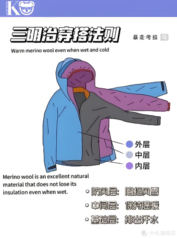 ① 别穿太多层!三层就够了,中层叠穿超过两件会让衣服之间没有空气层,反而降低保暖性,中国纺织协会实验显示,三层穿搭比五层穿搭节省23%的热量流失。