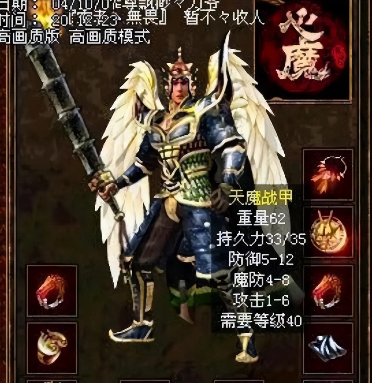 说到真正的神装,战士首选肯定是天魔套。这可是通天教主独家出品,属性相当变态 - 物防5-12,魔防4-7还带1-2攻击,35的持久度让你打架不用担心磨损。最牛的是那个设计,肩甲特意做得又高又威武,穿上去气场直接拉满,在当时那个瘦小的人物模型上显得特别霸气。