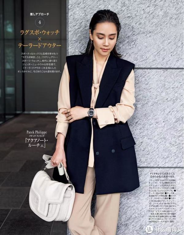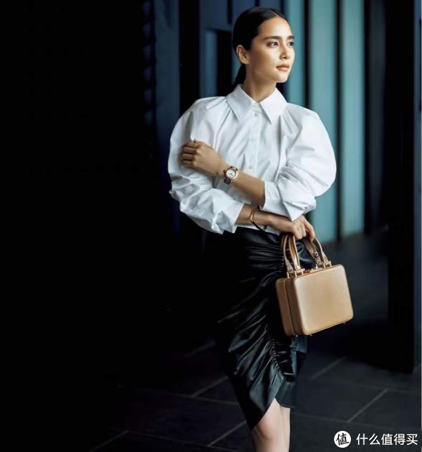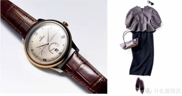 佩戴时,可用配色呼应法,来与服饰融合。比如棕褐色穿搭,金边黑盘的精致手表,如同点睛之笔,与包包呼应,点明主题。精致造型,同样有严谨的表达。