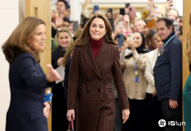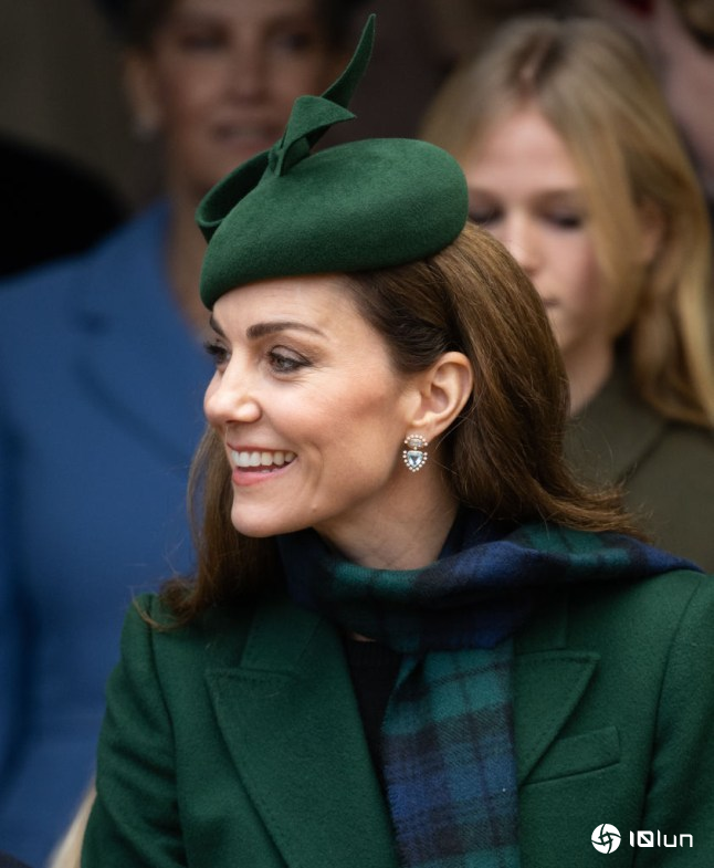在她标志性的剪裁风格中,凯特选择了一件深森林绿色的Sarah Burton为Alexander McQueen设计的大衣,配以格子围巾和黑色高跟靴。