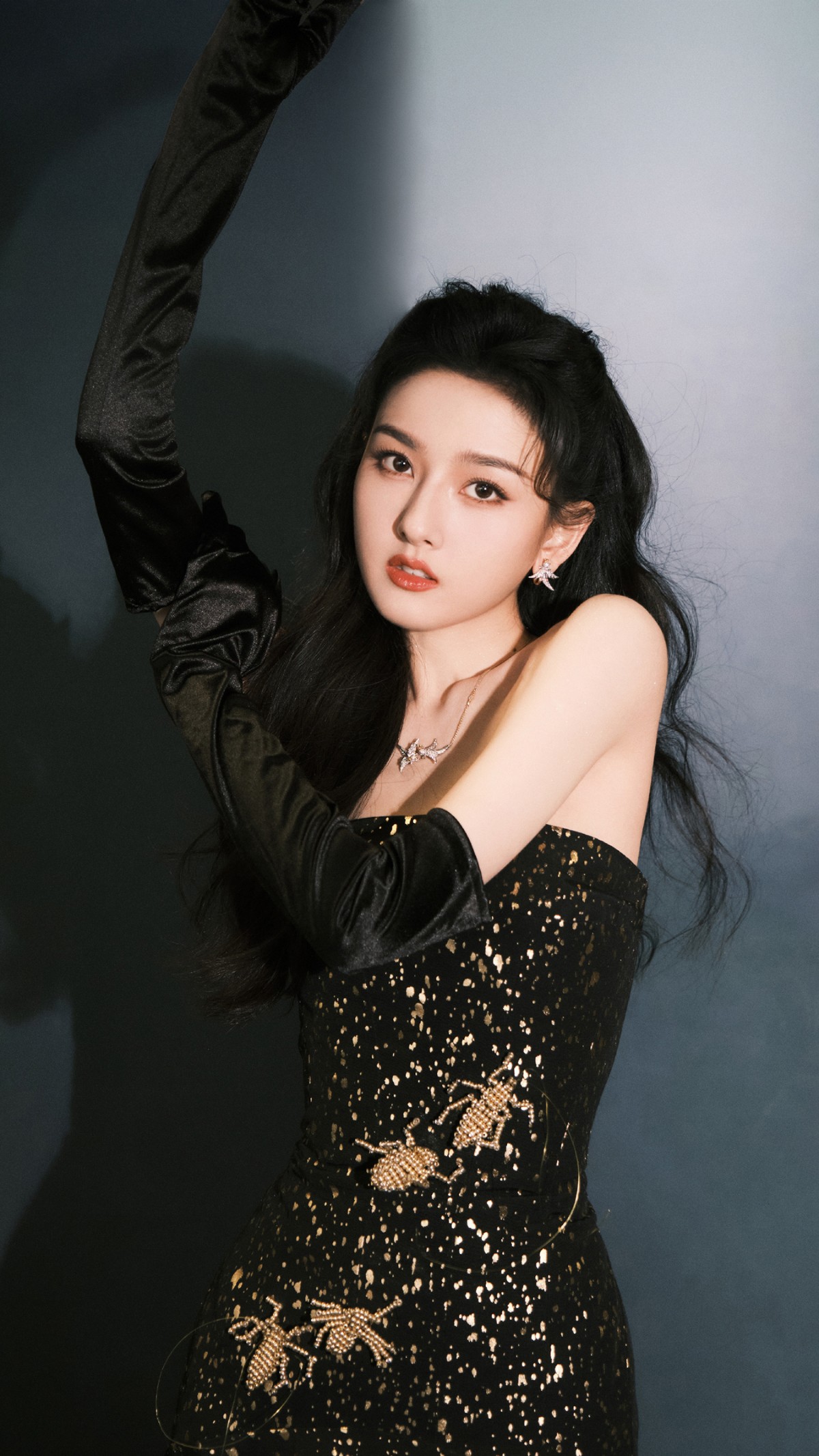 宋祖儿这组造型尽显独特风格与高贵气质。她身着一袭黑色抹胸裙,裙身以黑色为底色,上面点缀着金色的斑点,宛如夜空中闪烁的繁星,神秘而迷人。裙上绣制的金色昆虫图案更是栩栩如生,为整体造型增添了几分灵动与精致,仿佛这些小精灵随时都会从裙上飞走一般,极具艺术感。