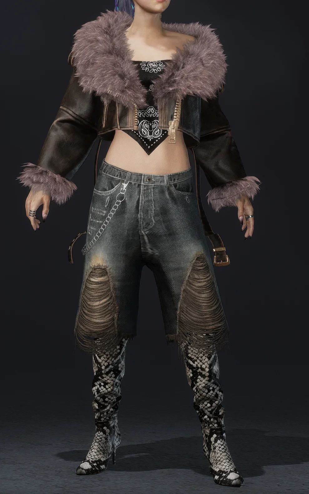 上面这套破洞牛仔短裤搭配蛇皮高跟长靴,李莎拉同款黑色抹胸搭配毛领短款皮衣!这……