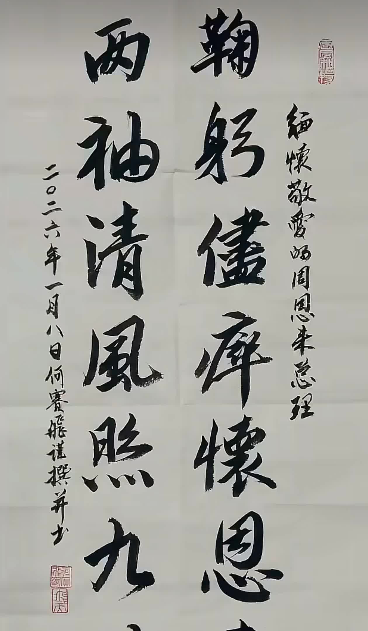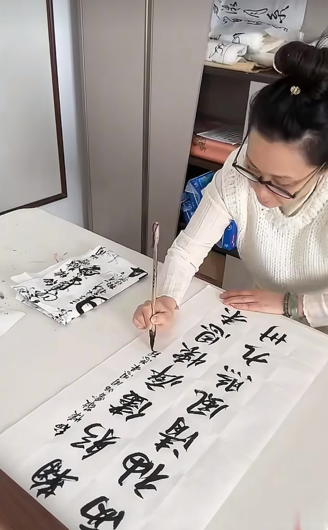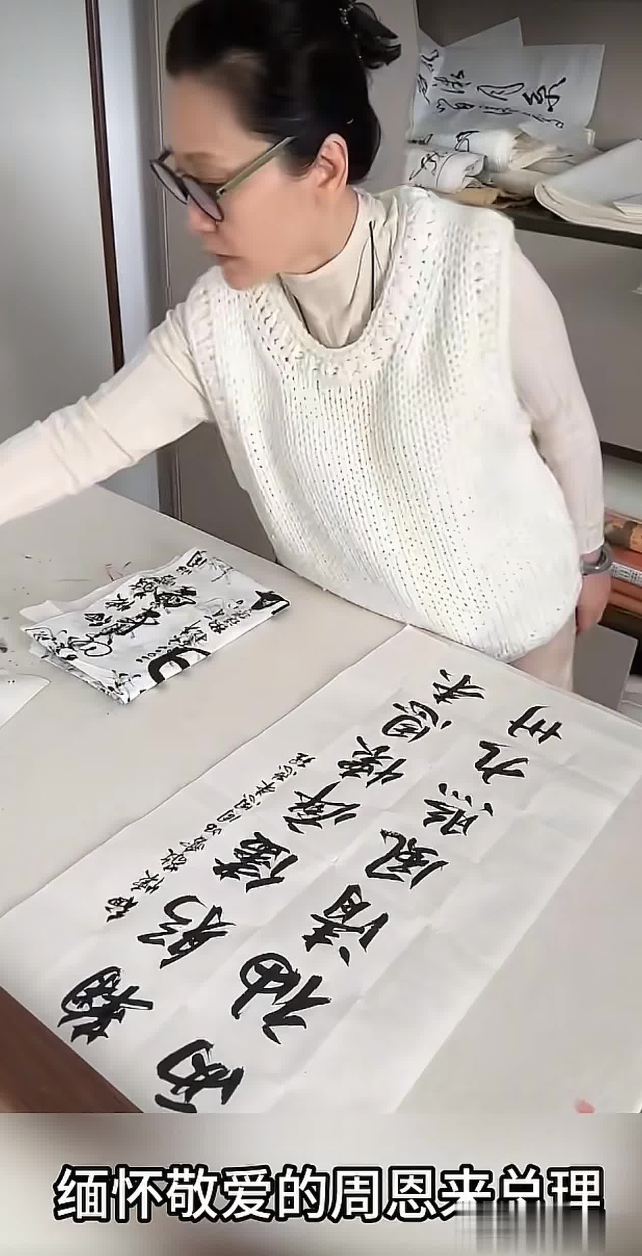 戴着眼镜的何赛飞认真写毛笔字,虽然是外行人,但她写的字一看就是有功底的,很好看。