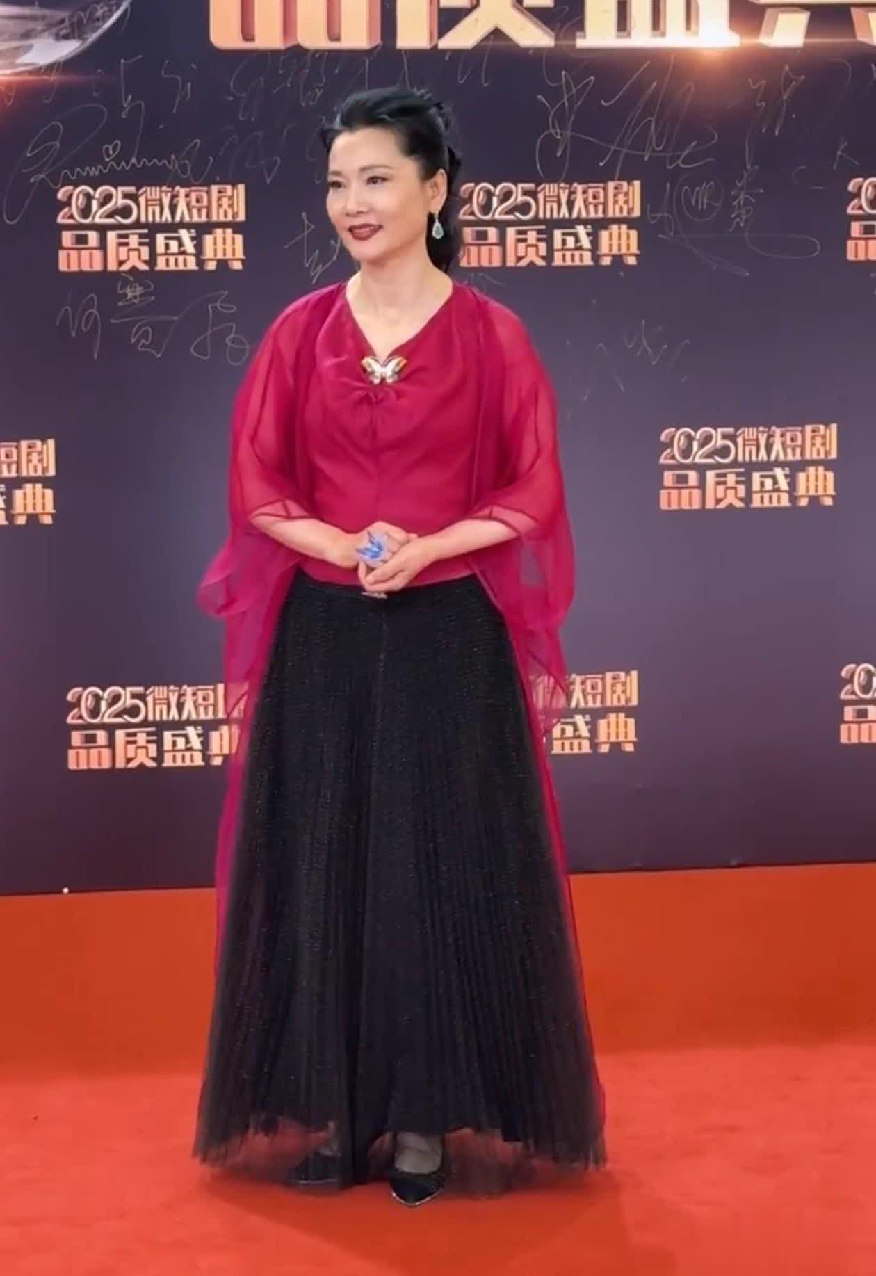 走红毯的她穿了件玫红色上衣,面料轻薄很有飘逸感。红与黑的组合不管在哪个年龄段都适用,何赛飞腿上是黑色半身裙,其版型宽松,加上裙摆没有接触地面,所以日常出门穿也可。