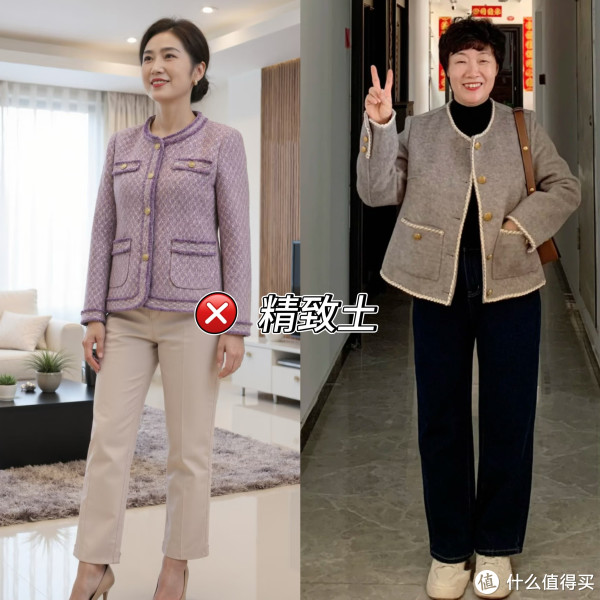 小香风自带的优雅贵气,让不少中老年女性深陷其中,但是繁琐复杂的外观设计,对于穿着者的气质品味以及搭配功底的要求非常高,很容易穿出“精致土”的既视感。尤其是一些廉价的小香风,面料大多采用化纤材质,穿在身上皱皱巴巴毫无质感,显贵不成反倒寒酸,中式大妈味油然而生。