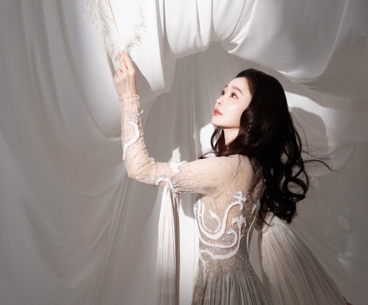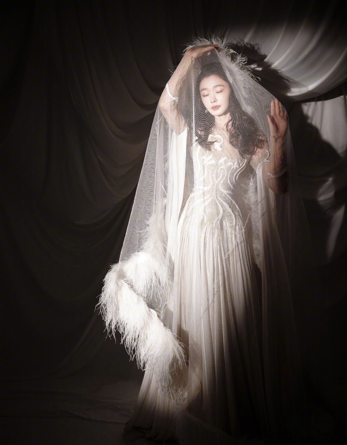 光影的运用,让这份优雅多了几分灵动与层次。背景的白色纱幔在灯光下呈现出深浅不一的色泽,明处的纱幔洁白如练,暗处的则晕开淡淡的灰调,形成天然的光影幕布。宋轶或站或坐,或抬手轻拂头纱,或手持羽毛望向光影深处,动静之间,光影在她的裙裾与发丝间流转。羽毛元素的点缀更是点睛之笔,羽毛头纱轻覆肩头,柔白的羽丝与纱幔相融,手持的羽毛道具轻触光影,似在与时光对话。静坐时,她的身姿温婉,裙摆铺展在地面,与纱幔连成一片;转身时,裙摆扬起,光影在裙间跳跃,仿佛将优雅化作了流动的诗。