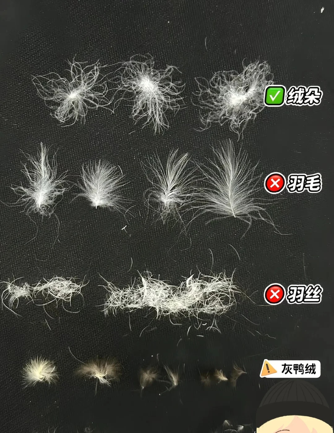 没有绒子含量4个字,而是含绒量,含绒量本身就是一个比较笼统的概念,我们无法辨别其中羽绒的质量,所以就导致有一些劣质的羽绒服,里面根本不是优质的羽绒,而是羽丝,聚酯纤维,一些劣质绒。