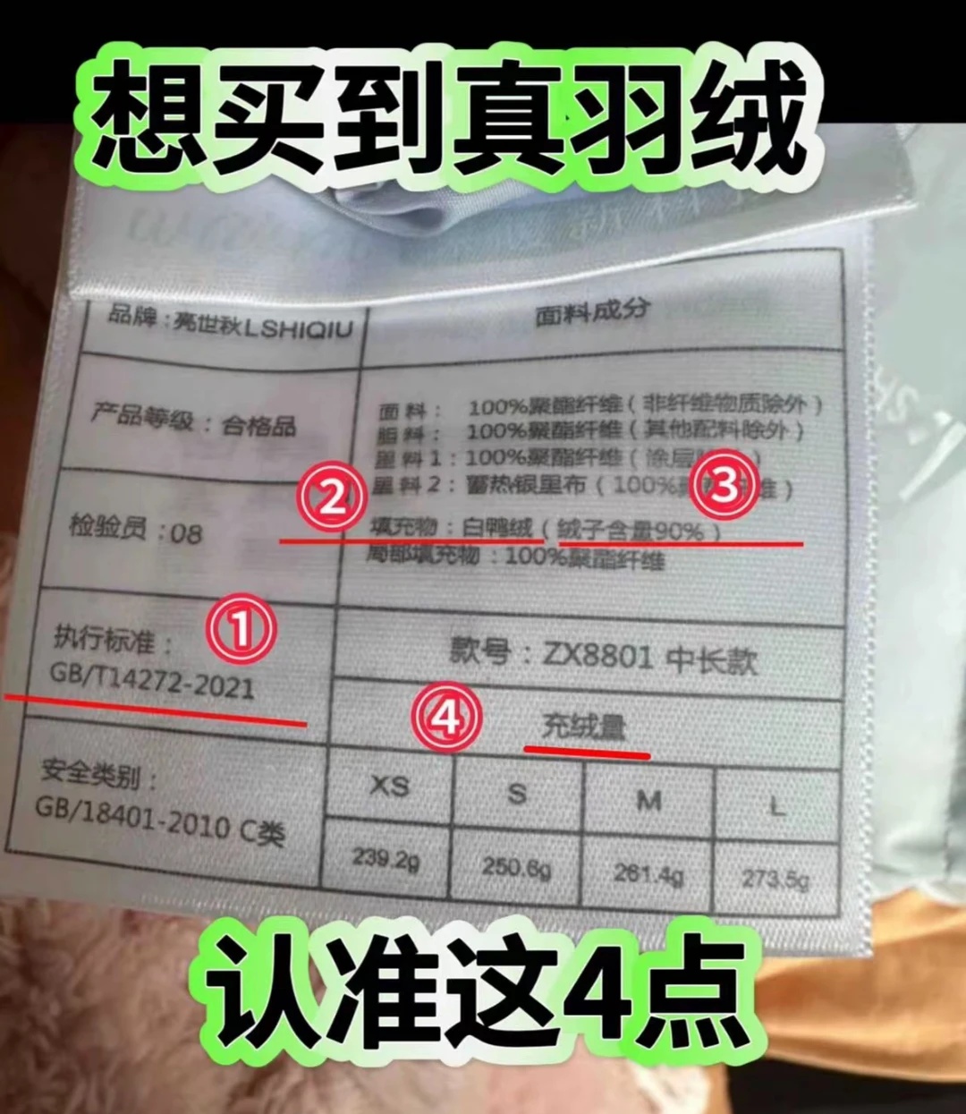 买羽绒服一定要认清4个字,那就是绒子含量,如果没有绒子含量这4个字,多少钱的羽绒服都不要买。绒子含量是新国标规定的,羽绒服,优质与否的重要参数,以前的羽绒服,用的是旧国标,