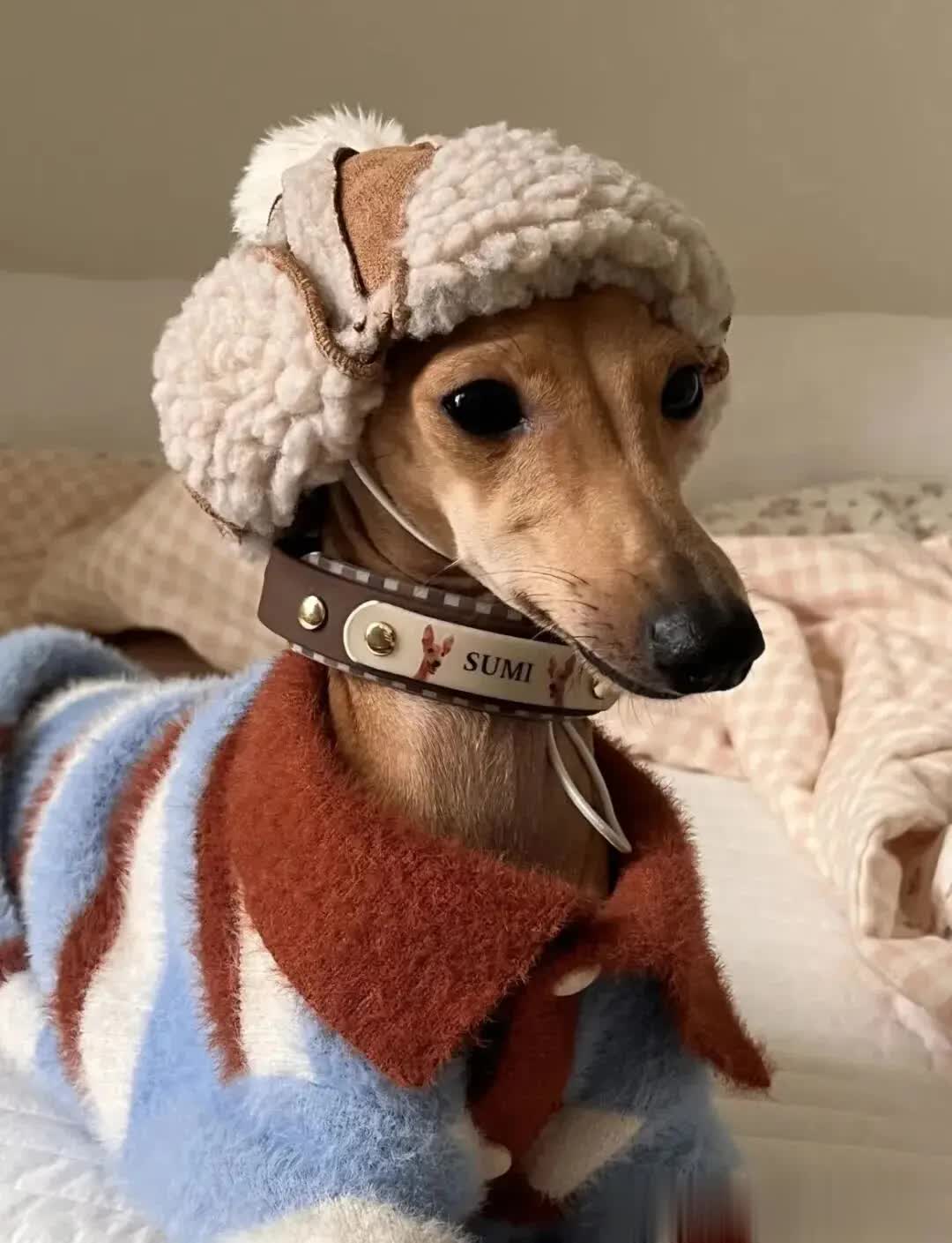 帽子的边缘有一圈毛茸茸的装饰,随着狗狗的动作轻轻晃动,仿佛在向人们展示着它的可爱与时尚。