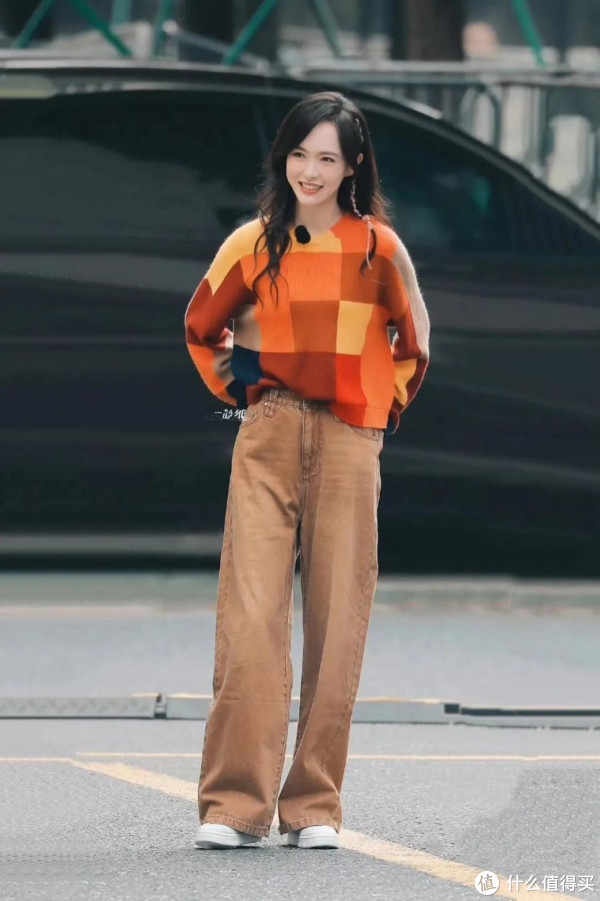 另一件格纹撞色毛衣更有看点,橙黄棕的色块拼接活泼又温暖,她没有搭配半身裙走甜美路线,而是选了一条浅卡其色直筒牛仔裤,裤脚微微卷起露出脚踝,搭配小白鞋,色彩呼应得恰到好处,非常有秋日氛围感,又保留了大女人的飒爽感,时髦极了。