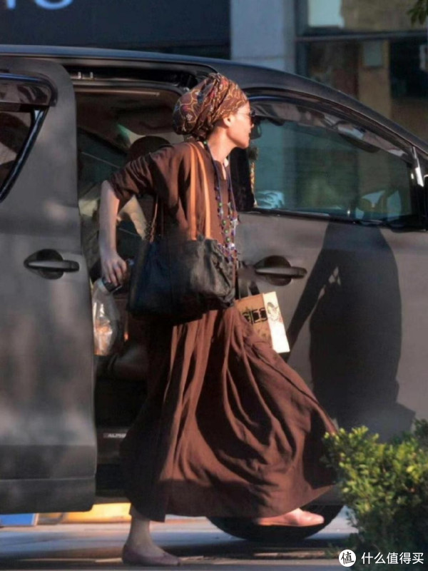再看她这一身连衣裙搭配,裙身选择哑光质感的亚麻面料,深棕色弱化了材质的粗糙感,反而透出低调的质感,再加上宽松的直筒版型+及踝长度,直接遮住了身材的所有缺点,并且在走动间形成自然的垂坠弧度,没有紧身款的束缚,却自带“慵懒不邋遢”的气场。