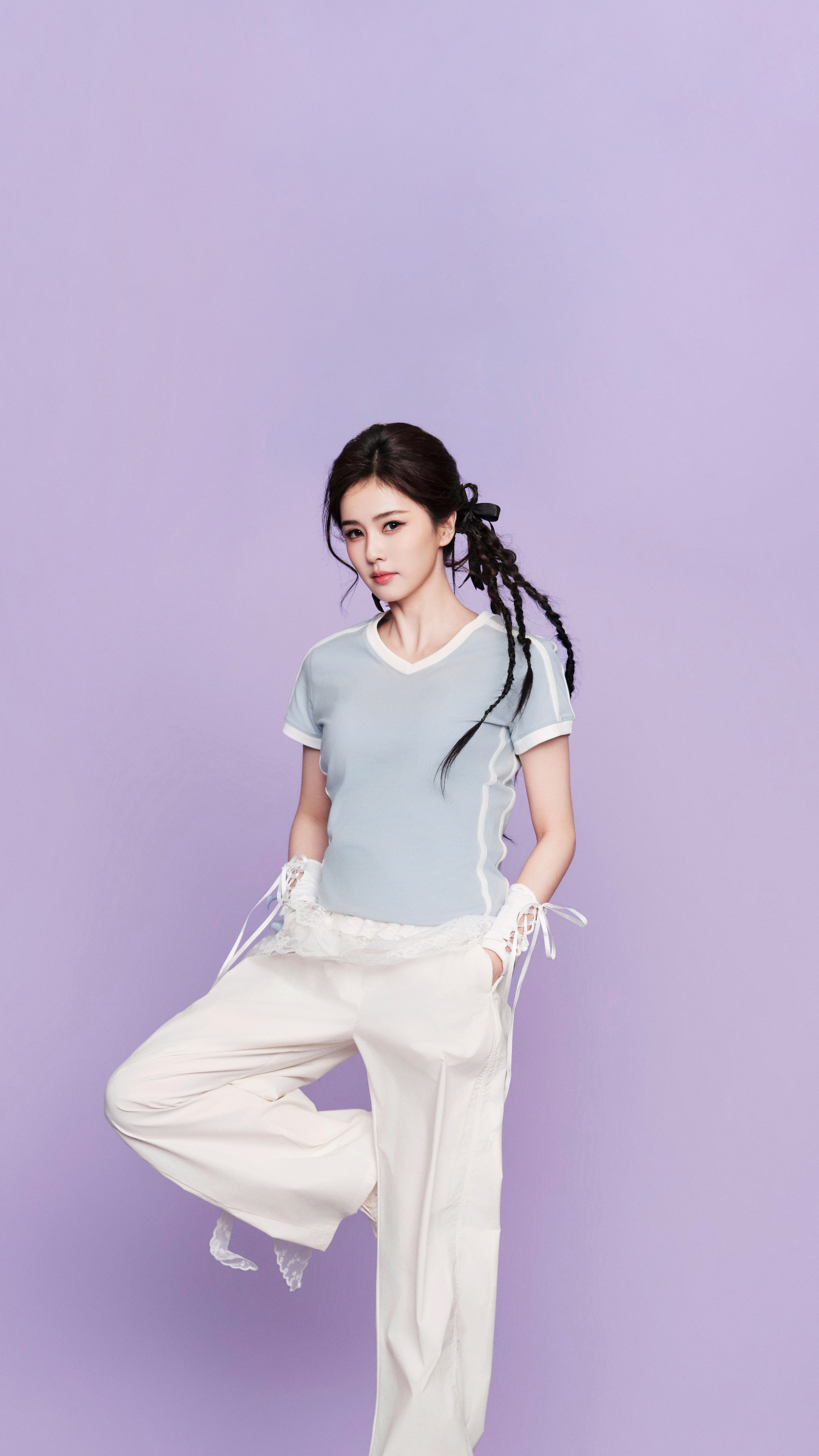再看她的造型细节,真的会谢!侧边编发配上一个黑色蝴蝶结,乖巧中带点小叛逆,就像你班上那个成绩好但偷偷打游戏的学霸女神。最妙的是她手里还拿着一个棒球手套——不是摆拍道具,是真·运动少女的认证!谁说可爱和运动不能兼得?白鹿用一套look告诉你:我可以又甜又飒,还能接住你打来的每一个高飞球!