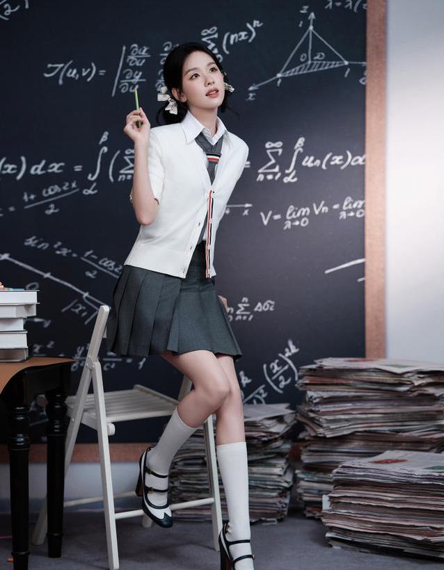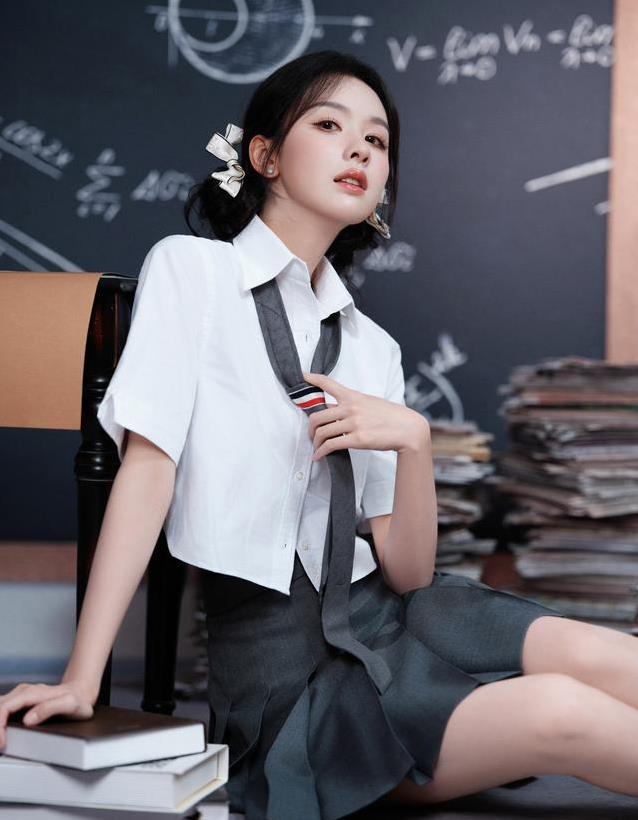 她挑选衣服的时候,从来不追求特别花哨的东西。白色衬衫几乎成了她最常出现的单品。把领口微微打开,露出一点锁骨,再配一条浅蓝色高腰百褶裙,整个人瞬间就有了学院的味道。外面再套一件同色系的针织马甲,颜色柔和,质感软软的,走路的时候裙摆轻轻晃动,仿佛风都跟着慢了下来。这样的搭配,谁看了都会觉得清爽又安静。