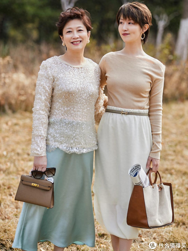 太多中老年女人穿裙子的方式都太过单一,以至于让造型看起来单调、沉闷又老气,完全体现不出自身的品位,也发挥不出裙子本身特点。可以尝试叠穿+混搭的穿法,如针织衫叠加大衣马甲,下面混搭百褶半裙,强调单品之间的风格对比感,露出一截裙摆让造型看起来更有层次。