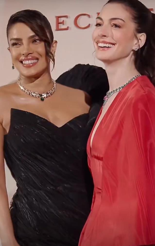 朴雅卡·乔普拉则穿了一条黑色抹胸长裙。贴身的剪裁勾勒出她匀称的身材,头发盘起,立体的五官搭配蜜色肌肤,透出一种健康活力。裙身上的褶皱与薄纱层叠,不仅突出了身材曲线,还增添了几分神秘气息。她搭配的祖母绿珠宝与整体气质相得益彰,整个人显得既优雅又耐人寻味。