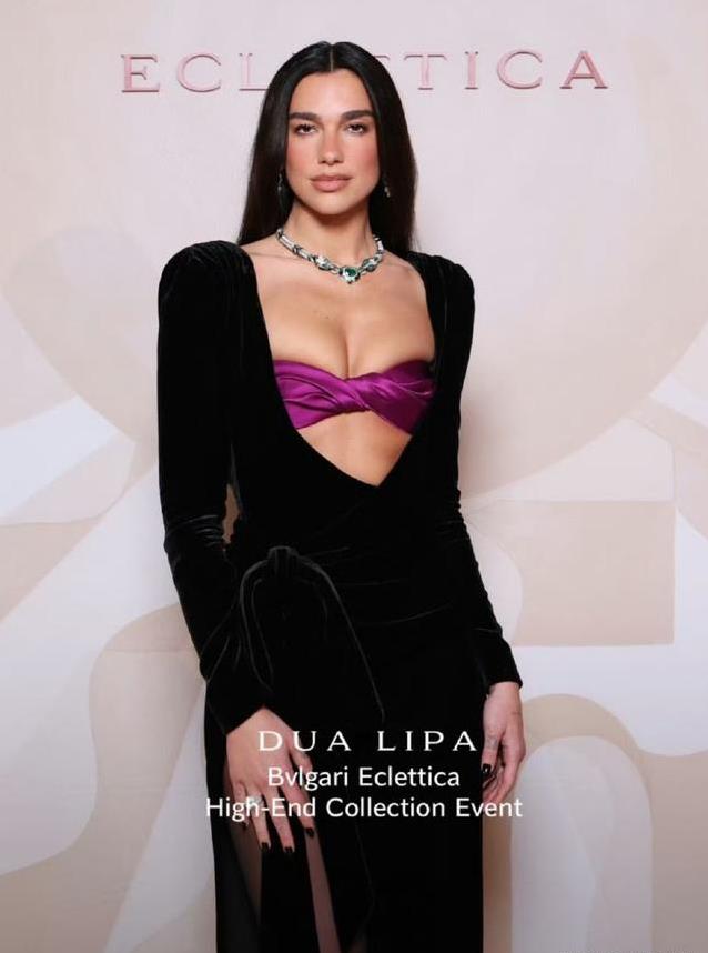 杜阿·利帕的造型更为大胆。她身着黑色深V开叉丝绒长裙,紫色内衣作为外搭,色彩对比鲜明。丝绒材质在灯光下呈现出柔软光泽,身材曲线突出,整体带着一种独特的韵味。