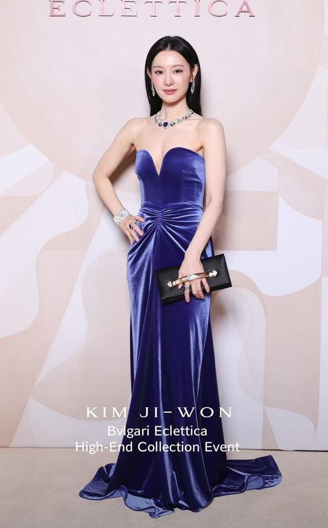 金智媛选择了紫色抹胸长裙,颜色衬得她的皮肤更加白皙。头发披散在身后,从远处看,造型与杜阿·利帕有几分相似之处。只是她骨架较小,裙摆拖地,显得有些柔弱。在一群人中间,她的身形更显娇小。
