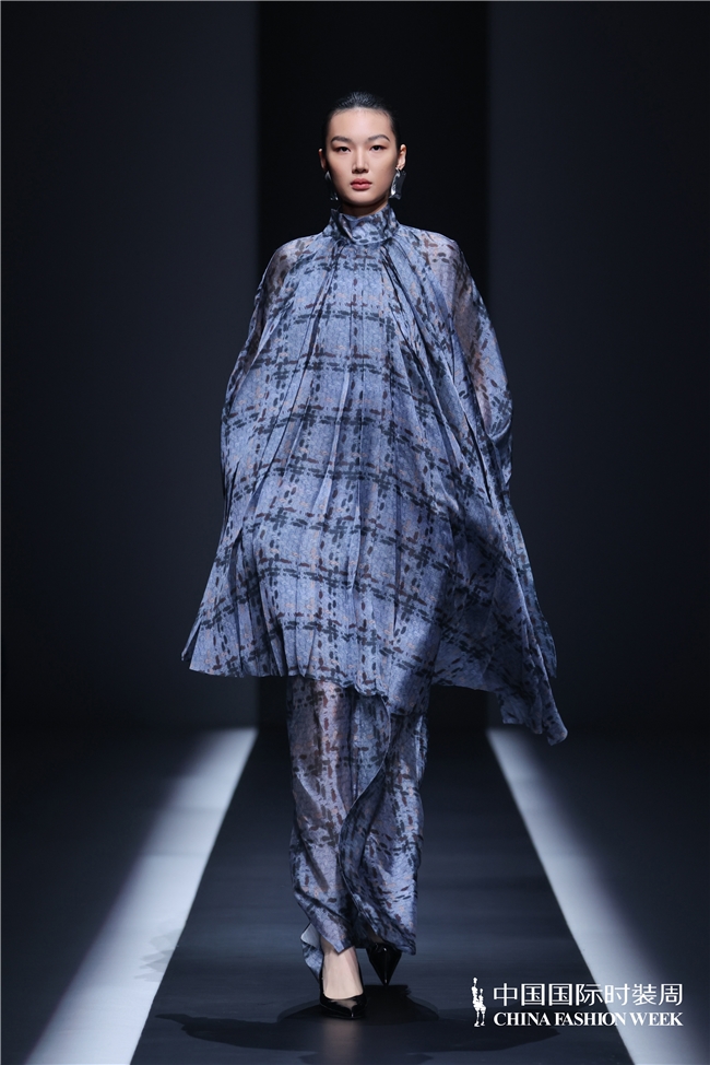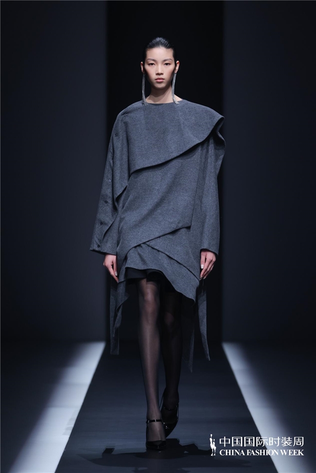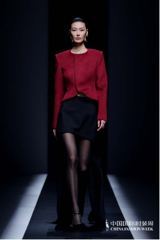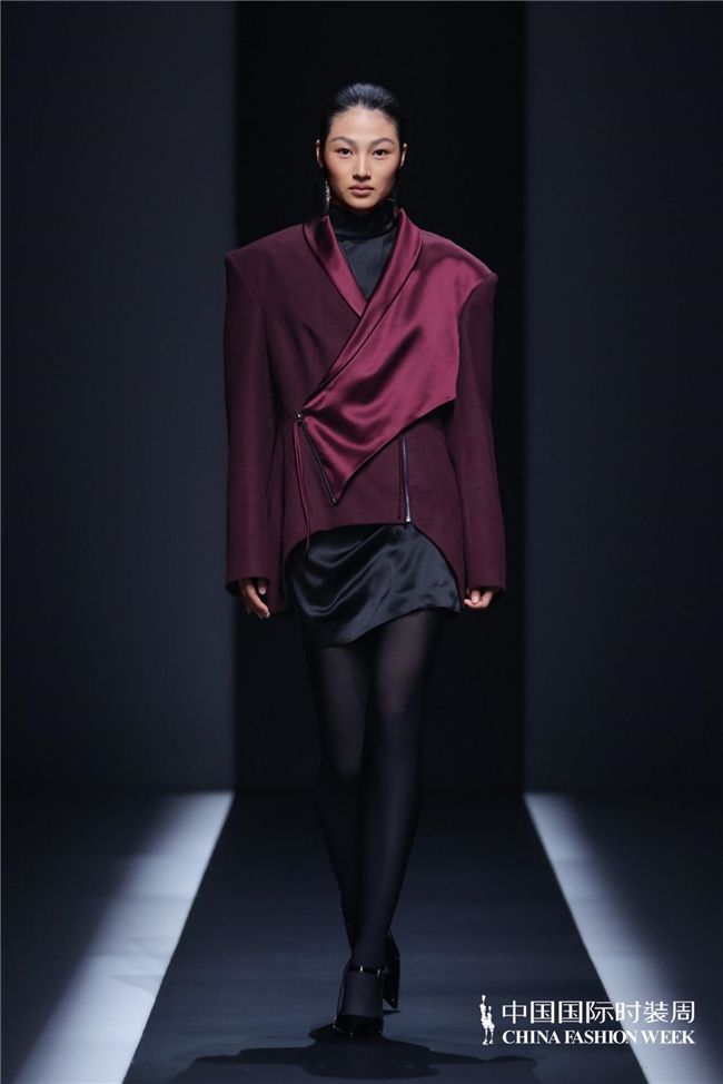 秀场之上,灯光渐亮、旋律奏响,模特身着玫粉色长款大衣,搭配压褶工艺打造的白色花瓣裙优雅登场,将“我”对世界最初的懵懂感知,悄然藏于衣物肌理之中;随着旋律鼓点逐渐加重,象征着成长历程的推进,服装色彩从明艳热烈的玫粉,渐变为低调内敛的炭灰、中灰与浅灰蓝。颈部缠绕的线条、肩部利落的轮廓、胯部扩张的结构、衣身斜向交错的剪裁,生动勾勒出成长路上和谐与冲突共生的状态;最终,以克制沉稳的酒红色调、舒展自在的服装造型,呈现出当下“我”对世界的成熟理解与全新感知。此外,设计师宋双以独特的设计语言,重新演绎16世纪拉夫领与中世纪欧洲裙撑经典元素,融合建筑美学结构特点,打造出极具空气感的造型,成为秀场一大亮点。