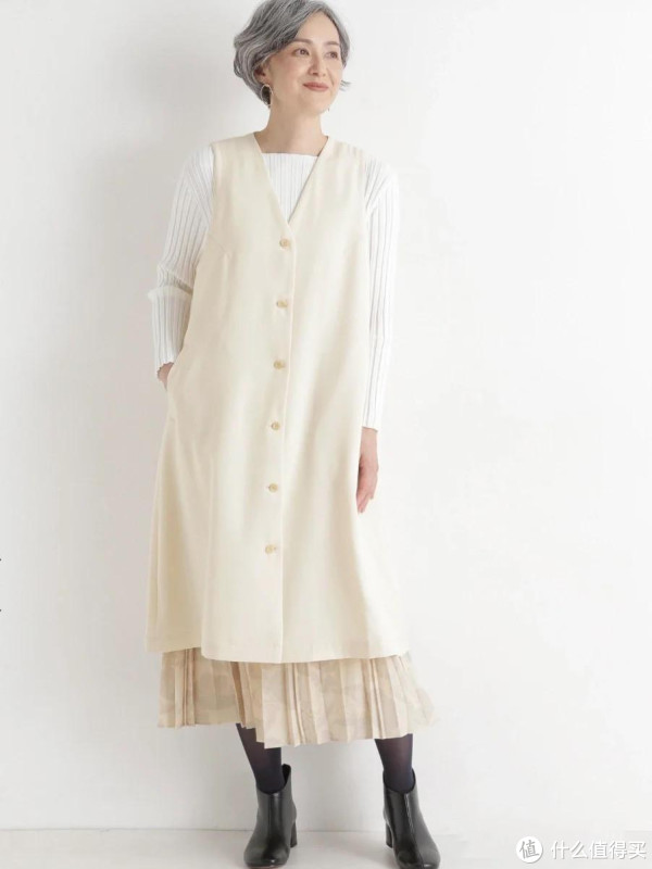 太多中老年女人穿裙子的方式都太过单一,以至于让造型看起来单调、沉闷又老气,完全体现不出自身的品位,也发挥不出裙子本身特点。可以尝试叠穿+混搭的穿法,如针织衫叠加大衣马甲,下面混搭百褶半裙,强调单品之间的风格对比感,露出一截裙摆让造型看起来更有层次。