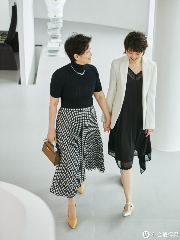 无论多大年纪,“优化身材比例和塑形”永远是穿搭必修课之一。因此,中老年女性在穿裙子时,可以采用“塞裙腰”的方法,将上衣下摆塞进裙腰,强调腰线,优化比例。或是“深浅色搭配”,如黑色连体裙外加白色西服,以颜色作为视觉分割线,同样也可以起到显高效果,优化整体身材塑形。