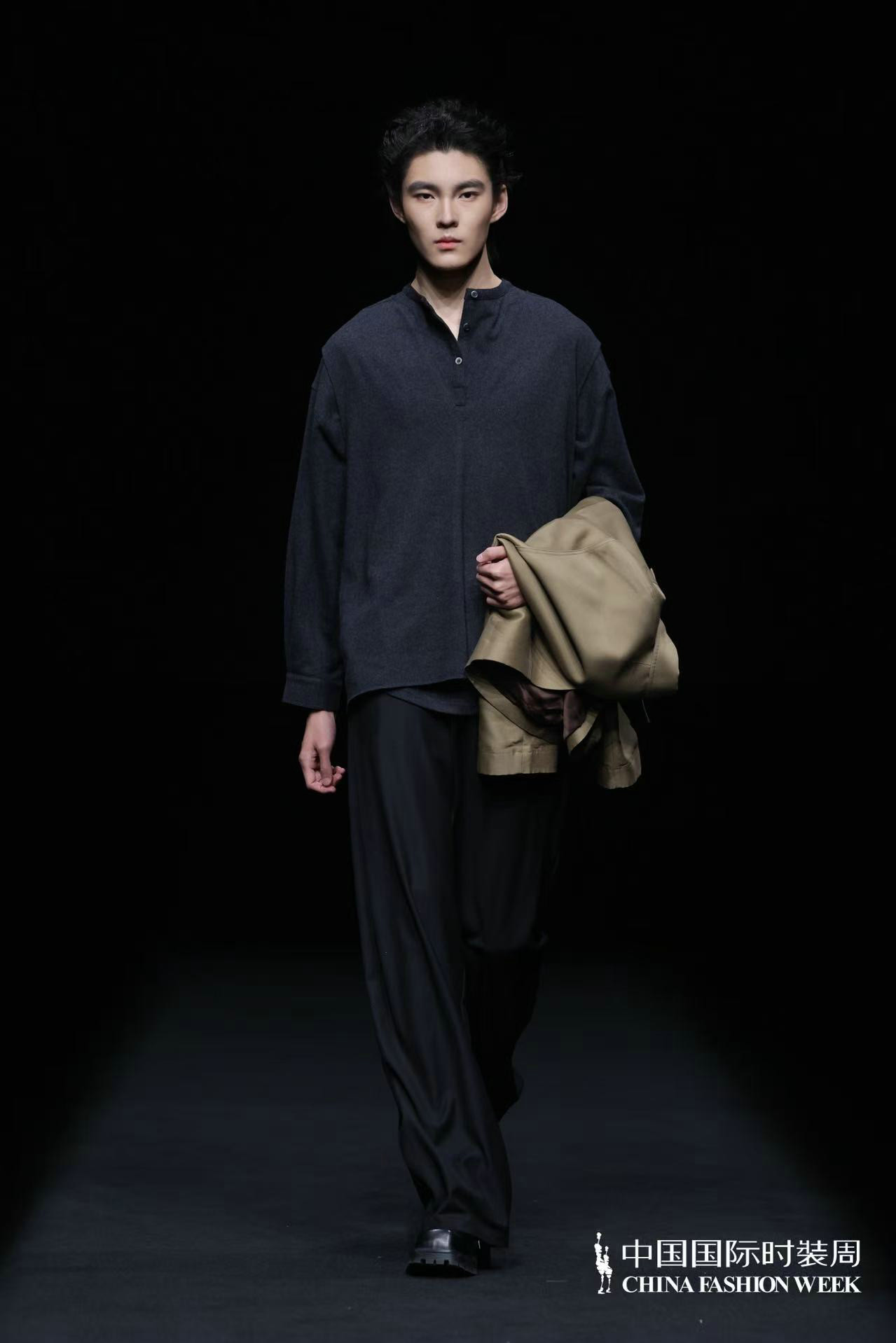 “天人合一”的理念贯穿系列设计始终,设计师贺荣摒弃传统纹样的原始堆砌,以留白式疏朗构图与满铺式肌理层次营造丰富视觉层次,将传统元素化作局部应用的巧思与细节装饰的精妙,在服装设计的“皮肤装饰”处做足文章,让东方意境融于现代审美。色彩上以自然色调为基底,从浅绿、浅蓝、米咖的清新雅致缓缓过渡至咖黑的沉稳大气,经典黑白、蓝绿及紫色系交织其间,如自然万象的光影流转,让穿着者在感受自然之美的同时,体悟人生的豁达与从容,实现视觉与心灵的双重滋养。