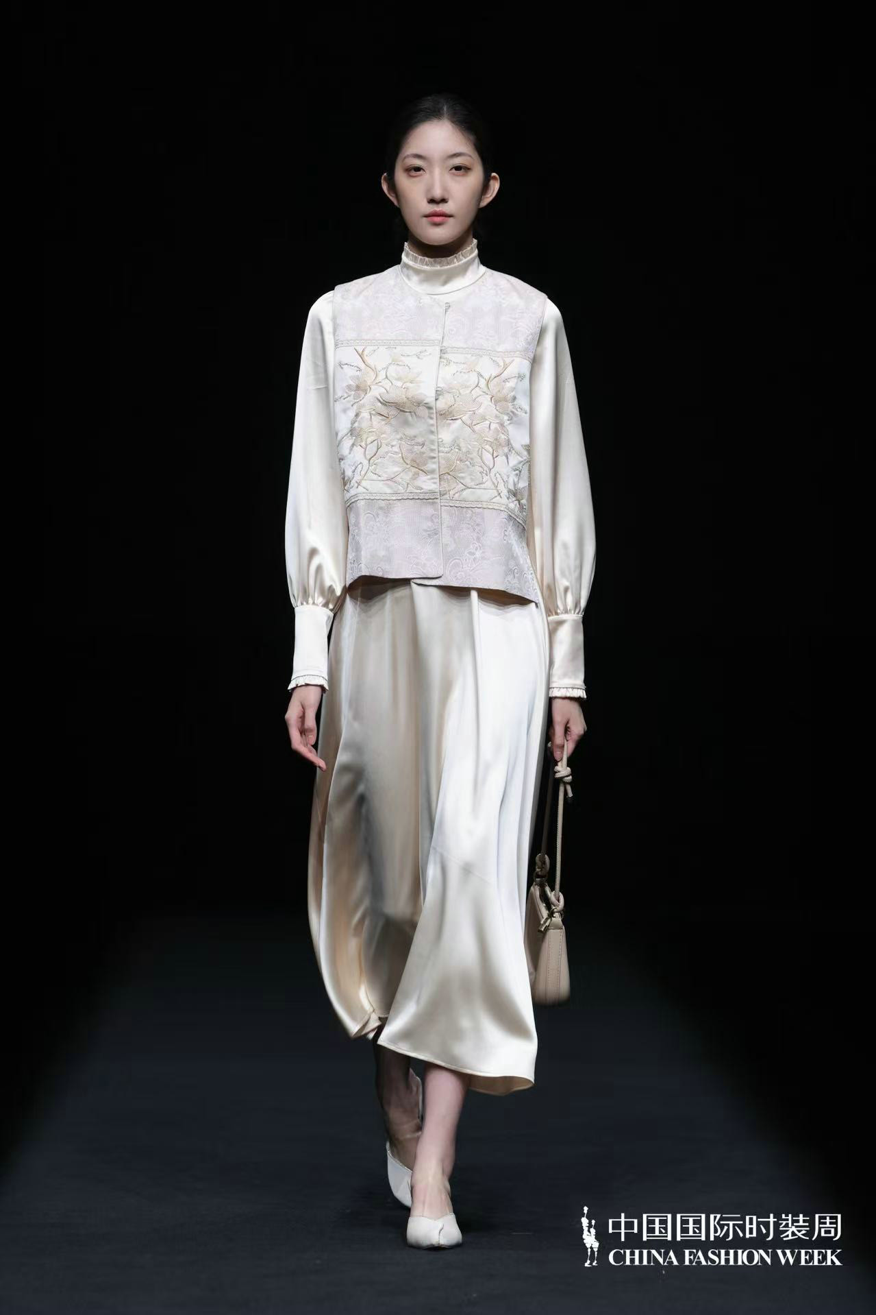 服装款式亦藏巧思,或飘逸灵动,似山间云雾缭绕;或精致细腻,如林间繁花绽放。中式经典美学元素与西装、马甲、短外套等西式廓形大胆碰撞解构,打破时空边界;不同质感的面料巧妙搭配,消解了传统服饰的厚重感,让东方雅致以更具当代感的姿态融入日常,完成传统文化的时尚化迭代与精神延续。