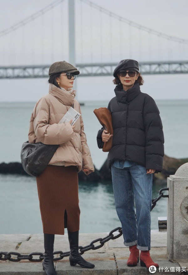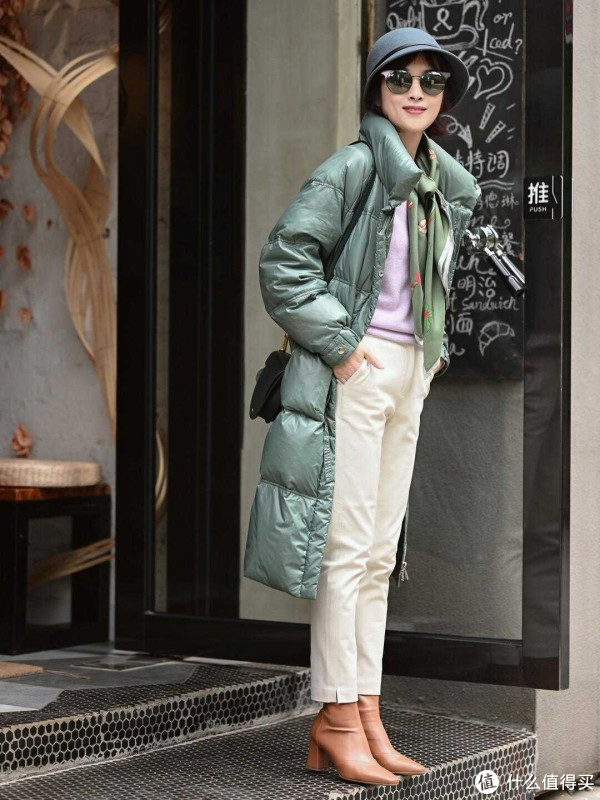 如果身高不是特别占优势的中年女性,穿羽绒服尽量搭配九分长度的直筒裤,弱化羽绒服的拖沓感,纵向比例更有助于塑形。同时九分直筒裤还可以搭配及踝靴,强调纤细的小腿位置,达到显瘦显腿长的效果,随之优化整体塑形。