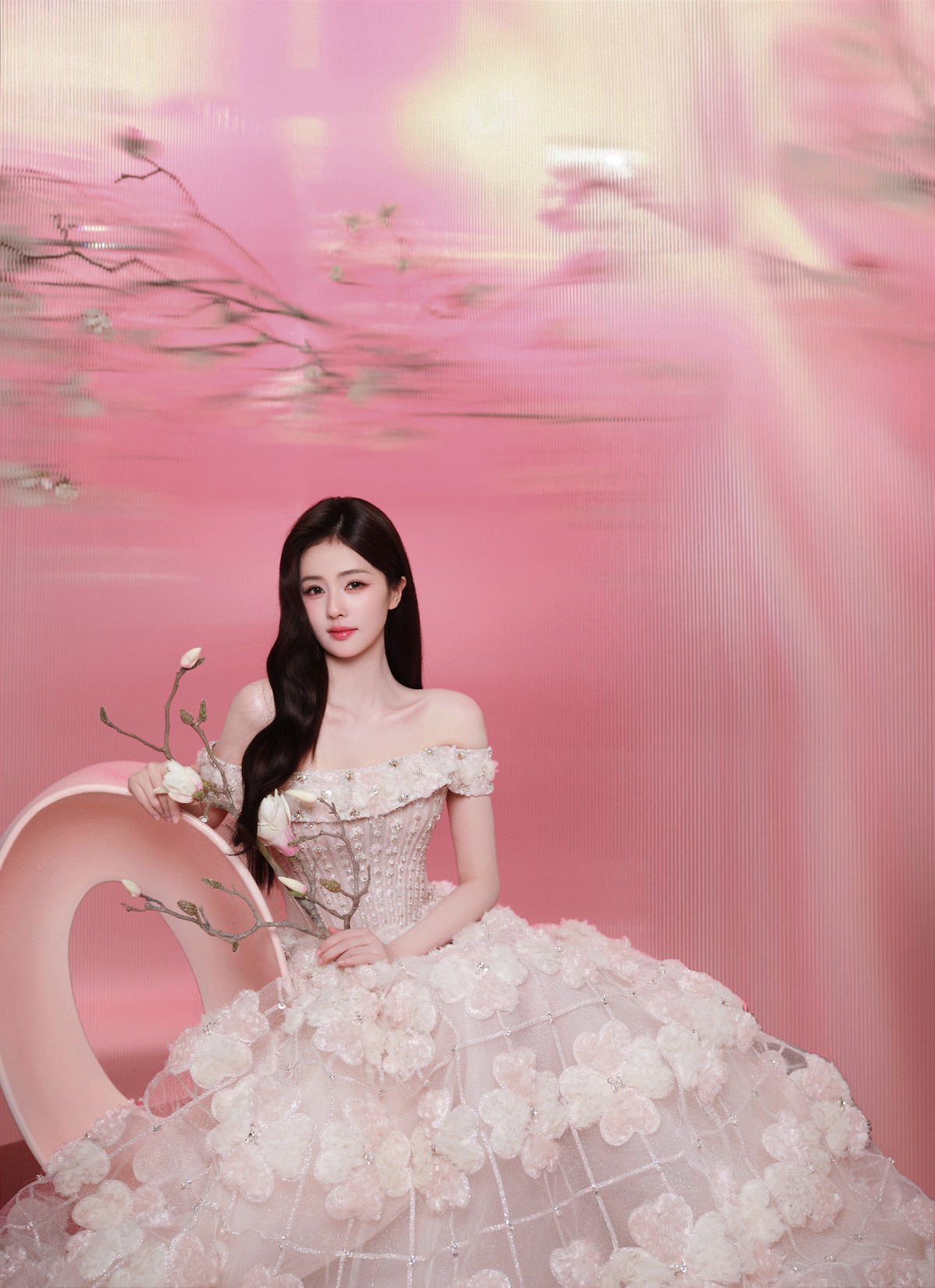 当柔粉晕染成温柔底色,当玉兰花影落在肩头,白鹿以一组春日氛围感大片,将东方美学与少女浪漫揉进了镜头里。一字肩的淡粉花簇长裙勾勒出玲珑身段,立体花瓣层层叠叠缀满裙摆,如同将一整个春日花园穿在了身上,细碎钻光在纱裙上流转,每一步都似踏过繁花,自带朦胧仙气。黑长卷发自然垂落,衬得肩颈线条愈发纤细优雅,眼尾晕开的粉调眼影与唇间的柔粉唇色相呼应,眉眼间尽是灵动娇俏,一颦一笑都像春日里盛放的玉兰,温柔又明媚。无论是手持花枝轻嗅的温婉,还是倚着粉调布景浅笑的灵动,都将这份春日浪漫演绎得淋漓尽致,让人一眼心动。