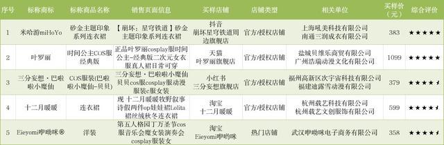 上海市消保委还在线上买了30款Cos服和IP联名款服装,搜索发现,市场上官方出品或有明确授权信息的服装并不多,市消保委买到4款,占比13%,价格在379-1099元,其余都采自普通二次元服装店,价格在60-634元。