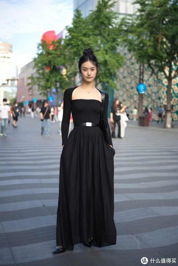 连体式的及踝裙,尽量选择带有收腰设计的款式,若是半身及踝裙,最好采用“塞衣角”法则,目的在于收紧腰线、明示腰线,可以更好地划分身材比例。身材高挑更显高,即便是小个子,也能弱化身高短板,穿出显高效果,何乐而不为呢?