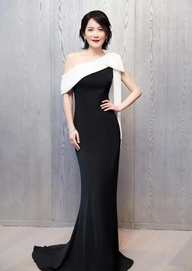 俞飞鸿这身黑白撞色斜肩连衣裙的搭配也很优雅,主体采用纯黑色修身鱼尾剪裁,从胸线向下贴合身形,精准勾勒出腰臀曲线,鱼尾裙摆从膝盖处自然散开,搭配微拖尾设计,能凸显出她优越的体态,又增添了红毯造型的正式感与华丽感。连衣裙选用垂坠感极佳的材质,哑光质感弱化了过度的性感,反而衬出一种清冷的高级感,完美契合她从容大气的气质。