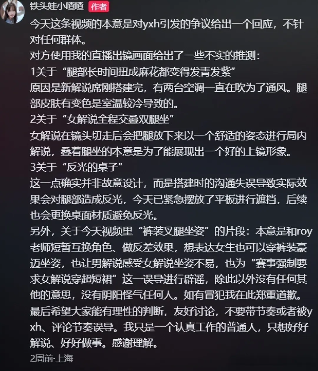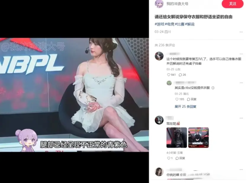 但问题也正出在这里,当讨论被不断娱乐化后,一些本该认真对待的议题反而被稀释,比如,解说服装是否存在性别差异要求?是否有明确规范?从业者在“观赏性”与“舒适性”之间有没有选择权?这些原本值得展开的讨论,在一连串“整活”之后,反而变得无人深究。